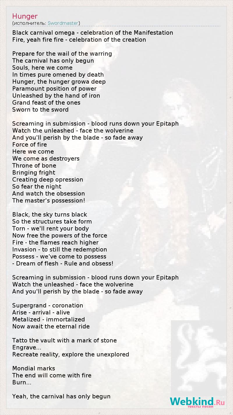 Black carnival omega - celebration of the Manifestation Fire, yeah fire fire - celebration of the creation Prepare for the wail of the warring The carnival has only begun Souls, here we come In times pure omened by death Hunger, the hunger growa deep Paramount position of power Unleashed by the hand of iron Grand feast of the ones Sworn to the sword Screaming in submission - blood runs down your Epitaph Watch the unleashed - face the wolverine And you'll perish by the blade - so fade away Force of fire Here we come We come as destroyers Throne of bone Bringing fright Creating deep opression So fear the night And watch the obsession The master's possession! Black, the sky turns black So the structures take form Torn - we'll rent your body Now free the powers of the force Fire - the flames reach higher Invasion - to still the redemption Possess - we've come to possess - Dream of flesh - Rule and obsess! Screaming in submission - blood runs down your Epitaph Watch the unleashed - face the wolverine And you'll perish by the blade - so fade away Supergrand - coronation Arise - arrival - alive Metalized - immortalized Now await the eternal ride Tatto the vault with a mark of stone Engrave... Recreate reality, explore the unexplored Mondial marks The end will come with fire Burn... Yeah, the carnival has only begun