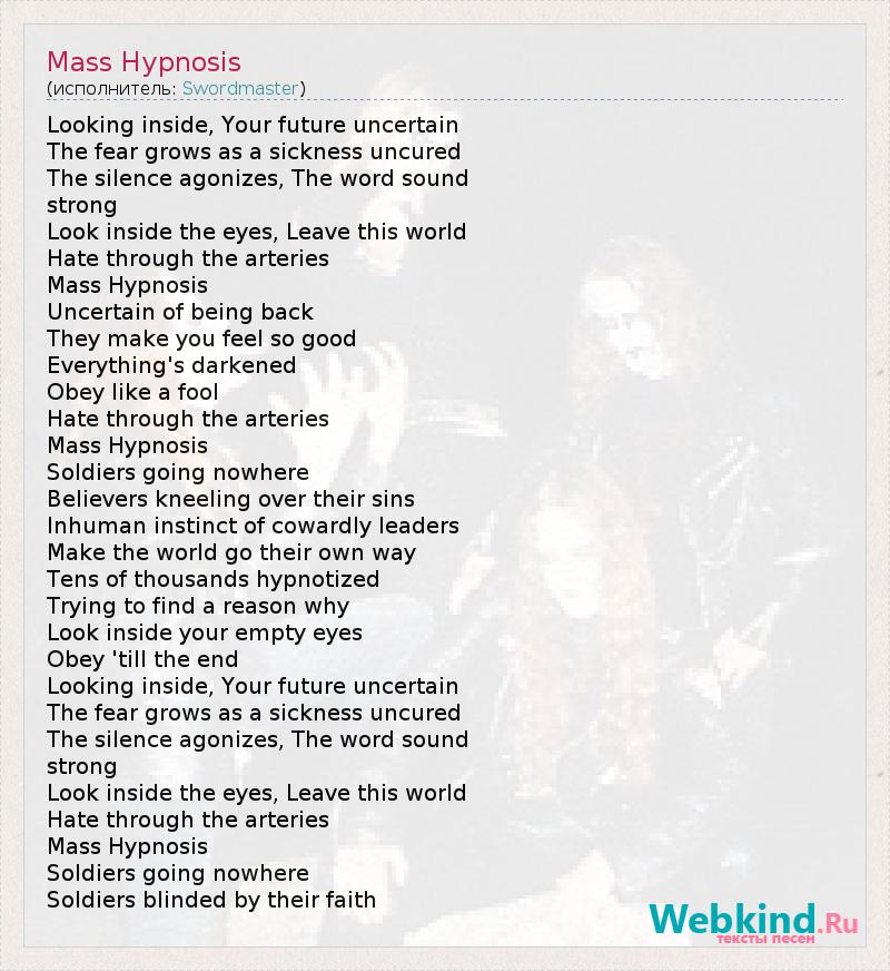 "Массовый гипноз" Вглядись получше внутрь себя, твое будущее неясно Страх дает о себе знать, как не вылеченная болезнь Молчание агонизирует, слова звучат сильней Посмотри в глаза, покинь мир Ненависть сквозь артерии Массового гипноза Теперь все ясно Вроде бы они делают так, чтобы тебе было хорошо Но что-то в этом не то Подчиняйся как дурак Солдаты идут в никуда Верующие замаливают свои грехи Бесчеловечные инстинкты малодушных лидеров Заставляют идти мир их путем Десятки тысяч загипнотизированных Пробуй найти ответ на вопрос "Почему?" Смотри в свои опустошенные глаза Подчиняйся до конца Солдаты идут, в никуда Солдаты ослеплены этой верой.