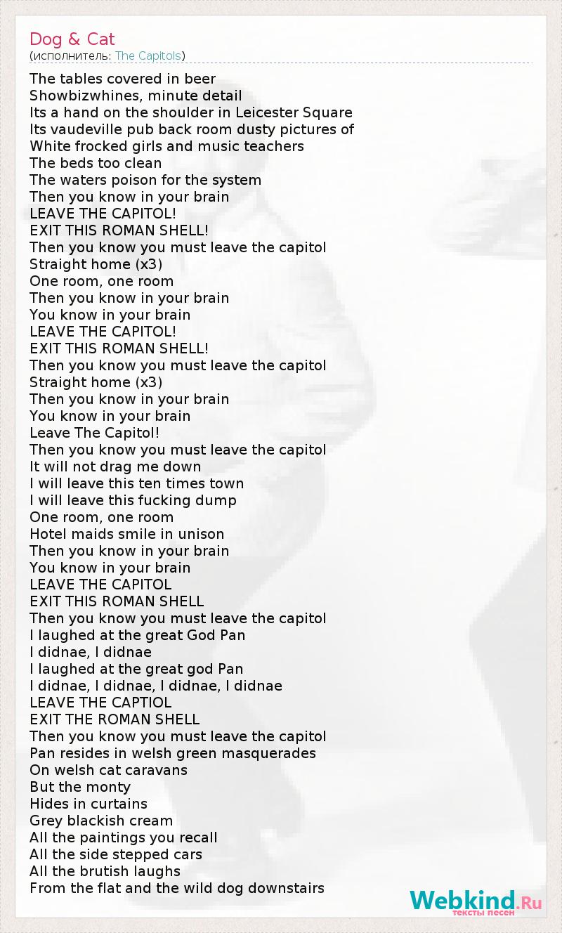 The tables covered in beer Showbizwhines, minute detail Its a hand on the shoulder in Leicester Square Its vaudeville pub back room dusty pictures of White frocked girls and music teachers The beds too clean The waters poison for the system Then you know in your brain LEAVE THE CAPITOL! EXIT THIS ROMAN SHELL! Then you know you must leave the capitol Straight home (x3) One room, one room Then you know in your brain You know in your brain LEAVE THE CAPITOL! EXIT THIS ROMAN SHELL! Then you know you must leave the capitol Straight home (x3) Then you know in your brain You know in your brain Leave The Capitol! Then you know you must leave the capitol It will not drag me down I will leave this ten times town I will leave this fucking dump One room, one room Hotel maids smile in unison Then you know in your brain You know in your brain LEAVE THE CAPITOL EXIT THIS ROMAN SHELL Then you know you must leave the capitol I laughed at the great God Pan I didnae, I didnae I laughed at the great god Pan I didnae, I didnae, I didnae, I didnae LEAVE THE CAPTIOL EXIT THE ROMAN SHELL Then you know you must leave the capitol Pan resides in welsh green masquerades On welsh cat caravans But the monty Hides in curtains Grey blackish cream All the paintings you recall All the side stepped cars All the brutish laughs From the flat and the wild dog downstairs