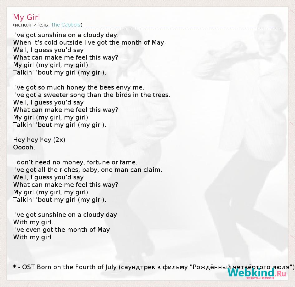 I've got sunshine on a cloudy day. When it's cold outside I've got the month of May. Well, I guess you'd say What can make me feel this way? My girl (my girl, my girl) Talkin' 'bout my girl (my girl). I've got so much honey the bees envy me. I've got a sweeter song than the birds in the trees. Well, I guess you'd say What can make me feel this way? My girl (my girl, my girl) Talkin' 'bout my girl (my girl). Hey hey hey (2x) Ooooh. I don't need no money, fortune or fame. I've got all the riches, baby, one man can claim. Well, I guess you'd say What can make me feel this way? My girl (my girl, my girl) Talkin' 'bout my girl (my girl). I've got sunshine on a cloudy day With my girl. I've even got the month of May With my girl * - OST Born on the Fourth of July (саундтрек к фильму "Рождённый четвёртого июля")