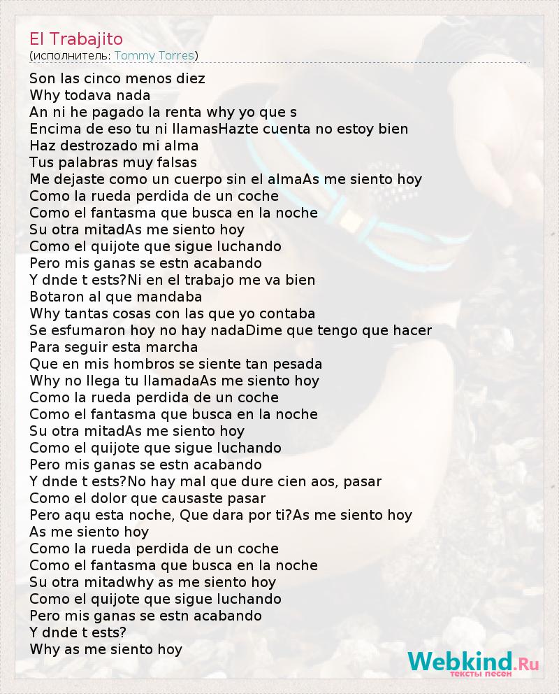 Son las cinco menos diez Why todava nada An ni he pagado la renta why yo que s Encima de eso tu ni llamasHazte cuenta no estoy bien Haz destrozado mi alma Tus palabras muy falsas Me dejaste como un cuerpo sin el almaAs me siento hoy Como la rueda perdida de un coche Como el fantasma que busca en la noche Su otra mitadAs me siento hoy Como el quijote que sigue luchando Pero mis ganas se estn acabando Y dnde t ests?Ni en el trabajo me va bien Botaron al que mandaba Why tantas cosas con las que yo contaba Se esfumaron hoy no hay nadaDime que tengo que hacer Para seguir esta marcha Que en mis hombros se siente tan pesada Why no llega tu llamadaAs me siento hoy Como la rueda perdida de un coche Como el fantasma que busca en la noche Su otra mitadAs me siento hoy Como el quijote que sigue luchando Pero mis ganas se estn acabando Y dnde t ests?No hay mal que dure cien aos, pasar Como el dolor que causaste pasar Pero aqu esta noche, Que dara por ti?As me siento hoy As me siento hoy Como la rueda perdida de un coche Como el fantasma que busca en la noche Su otra mitadwhy as me siento hoy Como el quijote que sigue luchando Pero mis ganas se estn acabando Y dnde t ests? Why as me siento hoy