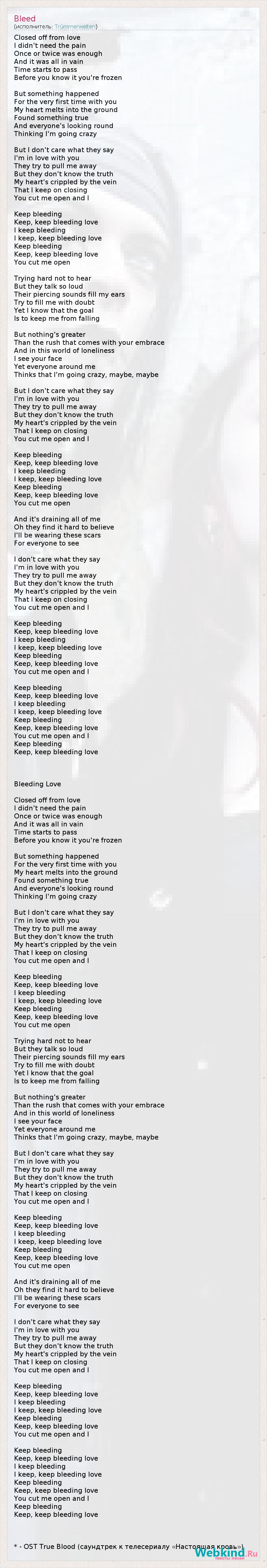 Closed off from love I didn't need the pain Once or twice was enough And it was all in vain Time starts to pass Before you know it you're frozen But something happened For the very first time with you My heart melts into the ground Found something true And everyone's looking round Thinking I'm going crazy But I don't care what they say I'm in love with you They try to pull me away But they don't know the truth My heart's crippled by the vein That I keep on closing You cut me open and I Keep bleeding Keep, keep bleeding love I keep bleeding I keep, keep bleeding love Keep bleeding Keep, keep bleeding love You cut me open Trying hard not to hear But they talk so loud Their piercing sounds fill my ears Try to fill me with doubt Yet I know that the goal Is to keep me from falling But nothing's greater Than the rush that comes with your embrace And in this world of loneliness I see your face Yet everyone around me Thinks that I'm going crazy, maybe, maybe But I don't care what they say I'm in love with you They try to pull me away But they don't know the truth My heart's crippled by the vein That I keep on closing You cut me open and I Keep bleeding Keep, keep bleeding love I keep bleeding I keep, keep bleeding love Keep bleeding Keep, keep bleeding love You cut me open And it's draining all of me Oh they find it hard to believe I'll be wearing these scars For everyone to see I don't care what they say I'm in love with you They try to pull me away But they don't know the truth My heart's crippled by the vein That I keep on closing You cut me open and I Keep bleeding Keep, keep bleeding love I keep bleeding I keep, keep bleeding love Keep bleeding Keep, keep bleeding love You cut me open and I Keep bleeding Keep, keep bleeding love I keep bleeding I keep, keep bleeding love Keep bleeding Keep, keep bleeding love You cut me open and I Keep bleeding Keep, keep bleeding love Bleeding Love Closed off from love I didn't need the pain Once or twice was enough And it was all in vain Time starts to pass Before you know it you're frozen But something happened For the very first time with you My heart melts into the ground Found something true And everyone's looking round Thinking I'm going crazy But I don't care what they say I'm in love with you They try to pull me away But they don't know the truth My heart's crippled by the vein That I keep on closing You cut me open and I Keep bleeding Keep, keep bleeding love I keep bleeding I keep, keep bleeding love Keep bleeding Keep, keep bleeding love You cut me open Trying hard not to hear But they talk so loud Their piercing sounds fill my ears Try to fill me with doubt Yet I know that the goal Is to keep me from falling But nothing's greater Than the rush that comes with your embrace And in this world of loneliness I see your face Yet everyone around me Thinks that I'm going crazy, maybe, maybe But I don't care what they say I'm in love with you They try to pull me away But they don't know the truth My heart's crippled by the vein That I keep on closing You cut me open and I Keep bleeding Keep, keep bleeding love I keep bleeding I keep, keep bleeding love Keep bleeding Keep, keep bleeding love You cut me open And it's draining all of me Oh they find it hard to believe I'll be wearing these scars For everyone to see I don't care what they say I'm in love with you They try to pull me away But they don't know the truth My heart's crippled by the vein That I keep on closing You cut me open and I Keep bleeding Keep, keep bleeding love I keep bleeding I keep, keep bleeding love Keep bleeding Keep, keep bleeding love You cut me open and I Keep bleeding Keep, keep bleeding love I keep bleeding I keep, keep bleeding love Keep bleeding Keep, keep bleeding love You cut me open and I Keep bleeding Keep, keep bleeding love * - OST True Blood (саундтрек к телесериалу «Настоящая кровь»)