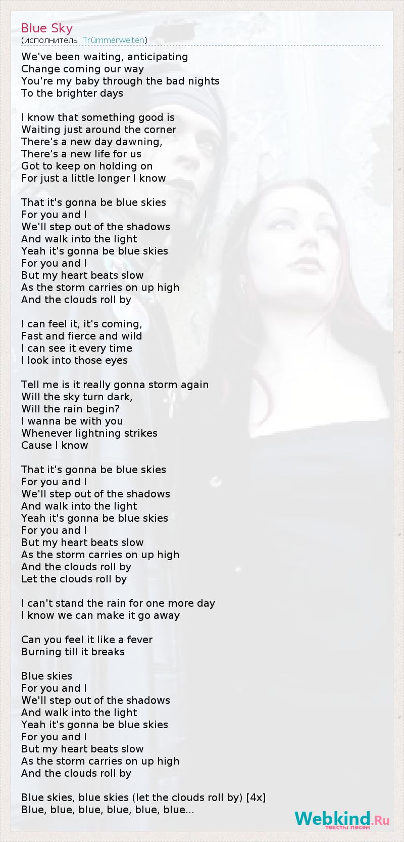 Мы ждём и надеемся, Что наступят перемены. Ты – моя любовь и тёмный ночью И светлым днём. Я знаю, что что-то хорошее Ждёт нас за углом. Начинается новый день, У нас впереди новая жизнь. Я знаю: нам нужно продержаться Ещё совсем немного. Нас ждут голубые небеса – Тебя и меня. Мы выйдем из тени И шагнём в лучи света. Да, нас ждут голубые небеса – Тебя и меня, Но мое сердце замирает, Когда в вышине бушует буря И надвигаются тучи. Я чувствую: она приближается: Быстрая, свирепая и дикая. Я всё время вижу её, Я заглядываю в её глаза. Скажи мне: неужели это снова буря? Неужели небо почернеет? Неужели начнётся дождь? Я хочу быть с тобой, Несмотря ни на какие молнии, Потому что я знаю: Нас ждут голубые небеса – Тебя и меня. Мы выйдем из тени И шагнём в лучи света. Да, нас ждут голубые небеса – Тебя и меня, Но мое сердце замирает, Когда в вышине бушует буря И надвигаются тучи. Пускай надвигаются тучи. Я не выдержу ещё день дождя. Я знаю: мы можем прогнать его. Ты чувствуешь? Это как лихорадка, Которая бушует, пока не утихнет. Голубые небеса – Для тебя и меня. Мы выйдем из тени И шагнём в лучи света. Да, нас ждут голубые небеса – Тебя и меня, Но мое сердце замирает, Когда в вышине бушует буря И надвигаются тучи. Голубые небеса, голубые небеса (пусть надвигаются тучи) [4x] Голубые, голубые, голубые, голубые...