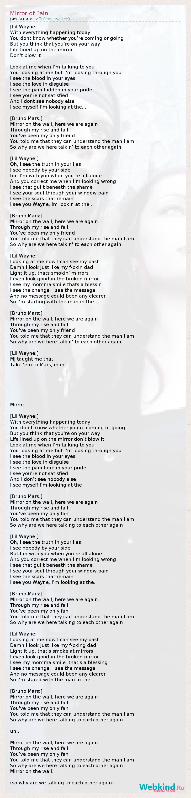 [Lil Wayne:] With everything happening today You dont know whether you're coming or going But you think that you're on your way Life lined up on the mirror Don't blow it Look at me when I'm talking to you You looking at me but I'm looking through you I see the blood in your eyes I see the love in disguise I see the pain hidden in your pride I see you're not satisfied And I dont see nobody else I see myself I'm looking at the... [Bruno Mars:] Mirror on the wall, here we are again Through my rise and fall You've been my only friend You told me that they can understand the man I am So why are we here talkin' to each other again [Lil Wayne:] Oh, I see the truth in your lies I see nobody by your side but I'm with you when you re all alone And you correct me when I'm looking wrong I see that guilt beneath the shame I see your soul through your window pain I see the scars that remain I see you Wayne, Im lookin at the... [Bruno Mars:] Mirror on the wall, here we are again Through my rise and fall You've been my only friend You told me that they can understand the man I am So why are we here talkin' to each other again [Lil Wayne:] Looking at me now I can see my past Damn I look just like my f-ckin dad Light it up, thats smokin' mirrors I even look good in the broken mirror I see my momma smile thats a blessin I see the change, I see the message And no message could been any clearer So I'm starting with the man in the... [Bruno Mars:] Mirror on the wall, here we are again Through my rise and fall You've been my only friend You told me that they can understand the man I am So why are we here talkin' to each other again [Lil Wayne:] MJ taught me that Take 'em to Mars, man Mirror [Lil Wayne:] With everything happening today You don't know whether you're coming or going But you think that you're on your way Life lined up on the mirror don't blow it Look at me when I'm talking to you You looking at me but I'm looking through you I see the blood in your eyes I see the love in disguise I see the pain here in your pride I see you're not satisfied And I don't see nobody else I see myself I'm looking at the [Bruno Mars:] Mirror on the wall, here we are again Through my rise and fall You've been my only fan You told me that they can understand the man I am So why are we here talking to each other again [Lil Wayne:] Oh, I see the truth in your lies I see nobody by your side But I'm with you when you re all alone And you correct me when I'm looking wrong I see that guilt beneath the shame I see your soul through your window pain I see the scars that remain I see you Wayne, I'm looking at the.. [Bruno Mars:] Mirror on the wall, here we are again Through my rise and fall You've been my only fan You told me that they can understand the man I am So why are we here talking to each other again [Lil Wayne:] Looking at me now I can see my past Damn I look just like my f-cking dad Light it up, that's smoke at mirrors I even look good in the broken mirror I see my momma smile, that's a blessing I see the change, I see the message And no message could been any clearer So I'm stared with the man in the.. [Bruno Mars:] Mirror on the wall, here we are again Through my rise and fall You've been my only fan You told me that they can understand the man I am So why are we here talking to each other again uh.. Mirror on the wall, here we are again Through my rise and fall You've been my only fan You told me that they can understand the man I am So why are we here talking to each other again Mirror on the wall. (so why are we talking to each other again)