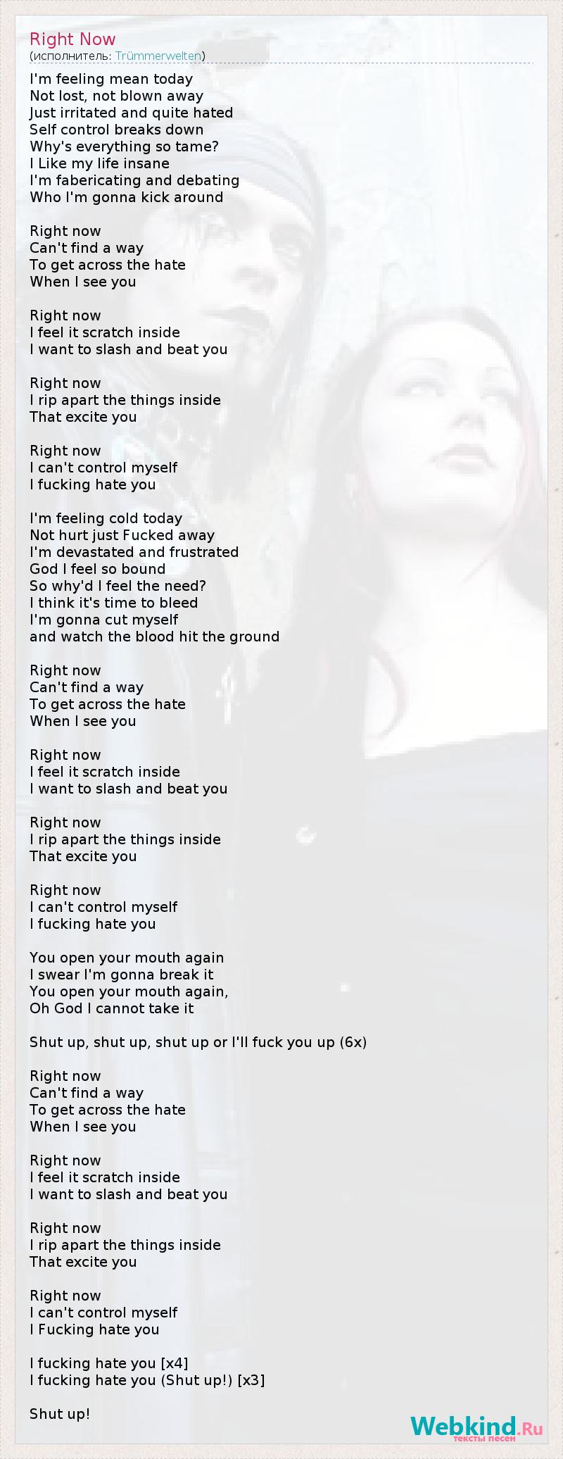 Что-то мне сегодня не по себе, Нет – это вовсе не отрешенность или ступор, Лишь раздраженность и тихая ярость. Самоконтролю пришел конец. Почему все так просто?! Я так люблю безумие в своей жизни Сейчас подумаем и решим, Кого сегодня побить. Прямо сейчас Не могу найти способа Погасить в себе злость, Когда вижу тебя. Прямо сейчас Прям кошки скребут, Мне охота кромсать и резать тебя. Прямо сейчас Я уничтожил все в себе, Что тебя привлекало. Прямо сейчас Я не могу удержаться, Я тебя, блин, ненавижу! Что-то мне сегодня холодно, Меня не ранили, а просто отымели. Я опустошен и разочарован, Боже, я полон решимости! Почему я чувствую это желание? Кажется, сейчас время пустить кровь, Сейчас порежусь И кровь прольется на землю. Прямо сейчас Не могу найти способа Погасить в себе злость, Когда вижу тебя. Прямо сейчас Прям кошки скребут, Мне охота кромсать и резать тебя. Прямо сейчас Я уничтожил все в себе, Что тебя привлекало. Прямо сейчас Я не могу удержаться, Я тебя, блин, ненавижу! Ты снова пасть открыл, Клянусь, я больше не допущу этого. Ты снова пасть открыл, Мой Бог, не могу стерпеть этого. Заткнись, заткнись, заткнись или я тебя у**у...(x6) Прямо сейчас Не могу найти способа Погасить в себе злость, Когда вижу тебя. Прямо сейчас Прям кошки скребут, Мне охота кромсать и резать тебя. Прямо сейчас Я уничтожил все в себе, Что тебя привлекало. Прямо сейчас Я не могу удержаться, Я тебя, блин, ненавижу! Я тебя, блин, ненавижу! (x4) Я тебя, блин, ненавижу! Заткнись! (х3) Заткнись!!!