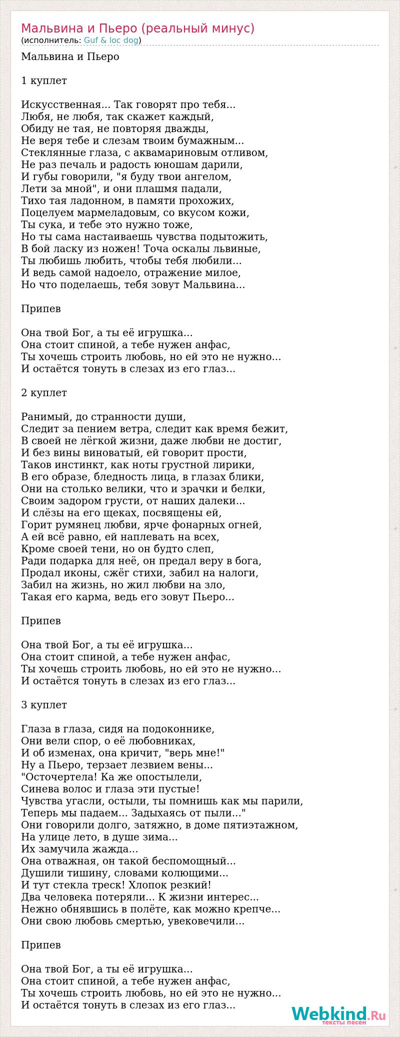 Мальвина и Пьеро 1 куплет Искусственная... Так говорят про тебя... Любя, не любя, так скажет каждый, Обиду не тая, не повторяя дважды, Не веря тебе и слезам твоим бумажным... Стеклянные глаза, с аквамариновым отливом, Не раз печаль и радость юношам дарили, И губы говорили, "я буду твои ангелом, Лети за мной", и они плашмя падали, Тихо тая ладонном, в памяти прохожих, Поцелуем мармеладовым, со вкусом кожи, Ты сука, и тебе это нужно тоже, Но ты сама настаиваешь чувства подытожить, В бой ласку из ножен! Точа оскалы львиные, Ты любишь любить, чтобы тебя любили... И ведь самой надоело, отражение милое, Но что поделаешь, тебя зовут Мальвина... Припев Она твой Бог, а ты её игрушка... Она стоит спиной, а тебе нужен анфас, Ты хочешь строить любовь, но ей это не нужно... И остаётся тонуть в слезах из его глаз... 2 куплет Ранимый, до странности души, Следит за пением ветра, следит как время бежит, В своей не лёгкой жизни, даже любви не достиг, И без вины виноватый, ей говорит прости, Таков инстинкт, как ноты грустной лирики, В его образе, бледность лица, в глазах блики, Они на столько велики, что и зрачки и белки, Своим задором грусти, от наших далеки... И слёзы на его щеках, посвящены ей, Горит румянец любви, ярче фонарных огней, А ей всё равно, ей наплевать на всех, Кроме своей тени, но он будто слеп, Ради подарка для неё, он предал веру в бога, Продал иконы, сжёг стихи, забил на налоги, Забил на жизнь, но жил любви на зло, Такая его карма, ведь его зовут Пьеро... Припев Она твой Бог, а ты её игрушка... Она стоит спиной, а тебе нужен анфас, Ты хочешь строить любовь, но ей это не нужно... И остаётся тонуть в слезах из его глаз... 3 куплет Глаза в глаза, сидя на подоконнике, Они вели спор, о её любовниках, И об изменах, она кричит, "верь мне!" Ну а Пьеро, терзает лезвием вены... "Осточертела! Ка же опостылели, Синева волос и глаза эти пустые! Чувства угасли, остыли, ты помнишь как мы парили, Теперь мы падаем... Задыхаясь от пыли..." Они говорили долго, затяжно, в доме пятиэтажном, На улице лето, в душе зима... Их замучила жажда... Она отважная, он такой беспомощный... Душили тишину, словами колющими... И тут стекла треск! Хлопок резкий! Два человека потеряли... К жизни интерес... Нежно обнявшись в полёте, как можно крепче... Они свою любовь смертью, увековечили... Припев Она твой Бог, а ты её игрушка... Она стоит спиной, а тебе нужен анфас, Ты хочешь строить любовь, но ей это не нужно... И остаётся тонуть в слезах из его глаз...
