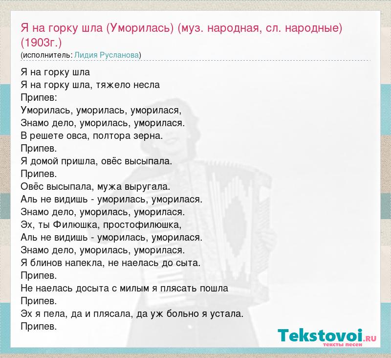 Я на горку шла Я на горку шла, тяжело несла Припев: Уморилась, уморилась, уморилася, Знамо дело, уморилась, уморилася. В решете овса, полтора зерна. Припев. Я домой пришла, овёс высыпала. Припев. Овёс высыпала, мужа выругала. Аль не видишь - уморилась, уморилася. Знамо дело, уморилась, уморилася. Эх, ты Филюшка, простофилюшка, Аль не видишь - уморилась, уморилася. Знамо дело, уморилась, уморилася. Я блинов напекла, не наелась до сыта. Припев. Не наелась досыта с милым я плясать пошла Припев. Эх я пела, да и плясала, да уж больно я устала. Припев.