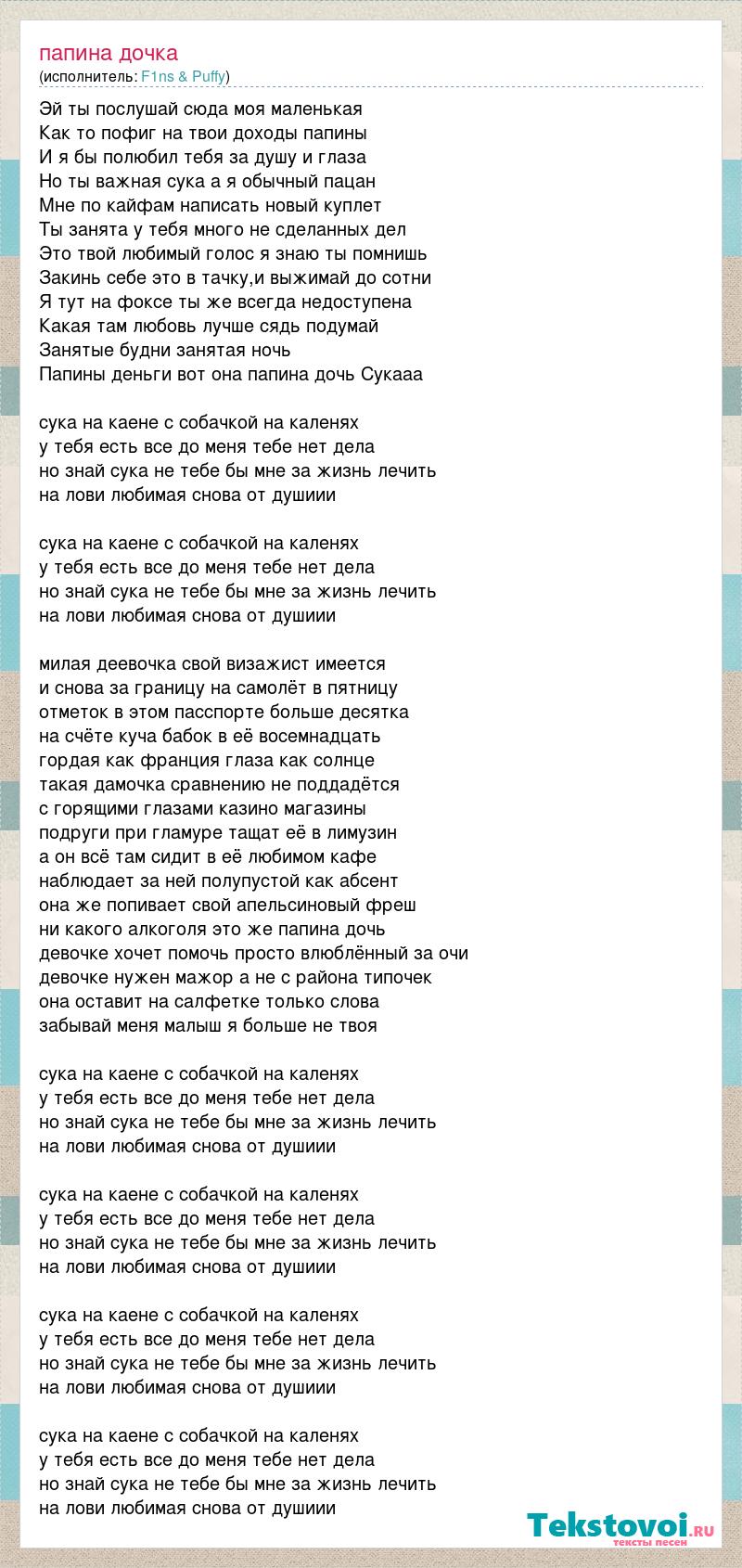 Эй ты послушай сюда моя маленькая Как то пофиг на твои доходы папины И я бы полюбил тебя за душу и глаза Но ты важная сука а я обычный пацан Мне по кайфам написать новый куплет Ты занята у тебя много не сделанных дел Это твой любимый голос я знаю ты помнишь Закинь себе это в тачку,и выжимай до сотни Я тут на фоксе ты же всегда недоступена Какая там любовь лучше сядь подумай Занятые будни занятая ночь Папины деньги вот она папина дочь Сукааа сука на каене с собачкой на каленях у тебя есть все до меня тебе нет дела но знай сука не тебе бы мне за жизнь лечить на лови любимая снова от душиии сука на каене с собачкой на каленях у тебя есть все до меня тебе нет дела но знай сука не тебе бы мне за жизнь лечить на лови любимая снова от душиии милая деевочка свой визажист имеется и снова за границу на самолёт в пятницу отметок в этом пасспорте больше десятка на счёте куча бабок в её восемнадцать гордая как франция глаза как солнце такая дамочка сравнению не поддадётся с горящими глазами казино магазины подруги при гламуре тащат её в лимузин а он всё там сидит в её любимом кафе наблюдает за ней полупустой как абсент она же попивает свой апельсиновый фреш ни какого алкоголя это же папина дочь девочке хочет помочь просто влюблённый за очи девочке нужен мажор а не с района типочек она оставит на салфетке только слова забывай меня малыш я больше не твоя сука на каене с собачкой на каленях у тебя есть все до меня тебе нет дела но знай сука не тебе бы мне за жизнь лечить на лови любимая снова от душиии сука на каене с собачкой на каленях у тебя есть все до меня тебе нет дела но знай сука не тебе бы мне за жизнь лечить на лови любимая снова от душиии сука на каене с собачкой на каленях у тебя есть все до меня тебе нет дела но знай сука не тебе бы мне за жизнь лечить на лови любимая снова от душиии сука на каене с собачкой на каленях у тебя есть все до меня тебе нет дела но знай сука не тебе бы мне за жизнь лечить на лови любимая снова от душиии