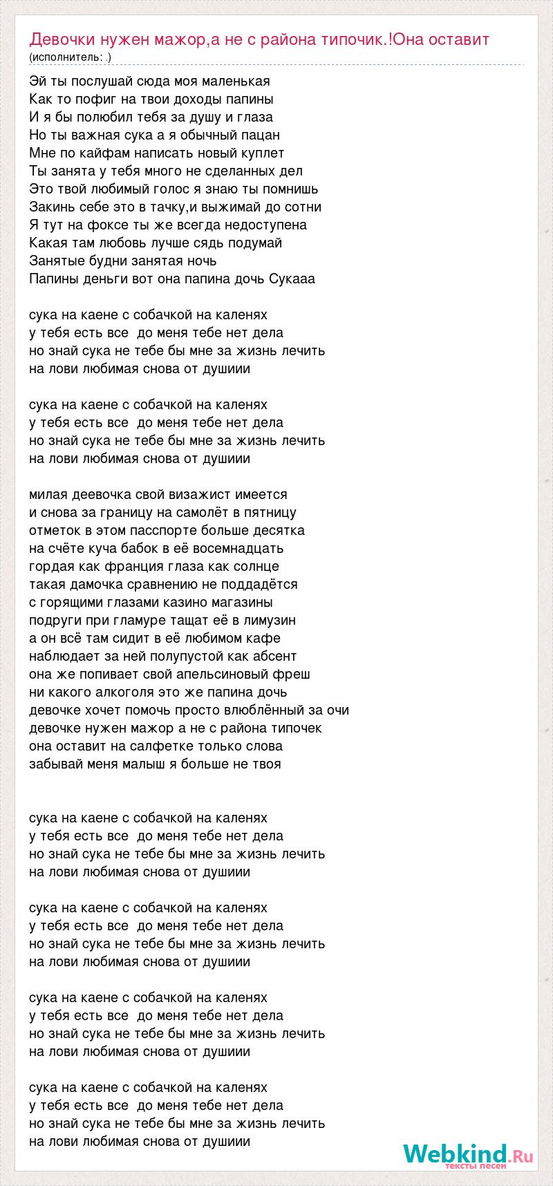 Эй ты послушай сюда моя маленькая Как то пофиг на твои доходы папины И я бы полюбил тебя за душу и глаза Но ты важная сука а я обычный пацан Мне по кайфам написать новый куплет Ты занята у тебя много не сделанных дел Это твой любимый голос я знаю ты помнишь Закинь себе это в тачку,и выжимай до сотни Я тут на фоксе ты же всегда недоступена Какая там любовь лучше сядь подумай Занятые будни занятая ночь Папины деньги вот она папина дочь Сукааа сука на каене с собачкой на каленях у тебя есть все до меня тебе нет дела но знай сука не тебе бы мне за жизнь лечить на лови любимая снова от душиии сука на каене с собачкой на каленях у тебя есть все до меня тебе нет дела но знай сука не тебе бы мне за жизнь лечить на лови любимая снова от душиии милая деевочка свой визажист имеется и снова за границу на самолёт в пятницу отметок в этом пасспорте больше десятка на счёте куча бабок в её восемнадцать гордая как франция глаза как солнце такая дамочка сравнению не поддадётся с горящими глазами казино магазины подруги при гламуре тащат её в лимузин а он всё там сидит в её любимом кафе наблюдает за ней полупустой как абсент она же попивает свой апельсиновый фреш ни какого алкоголя это же папина дочь девочке хочет помочь просто влюблённый за очи девочке нужен мажор а не с района типочек она оставит на салфетке только слова забывай меня малыш я больше не твоя сука на каене с собачкой на каленях у тебя есть все до меня тебе нет дела но знай сука не тебе бы мне за жизнь лечить на лови любимая снова от душиии сука на каене с собачкой на каленях у тебя есть все до меня тебе нет дела но знай сука не тебе бы мне за жизнь лечить на лови любимая снова от душиии сука на каене с собачкой на каленях у тебя есть все до меня тебе нет дела но знай сука не тебе бы мне за жизнь лечить на лови любимая снова от душиии сука на каене с собачкой на каленях у тебя есть все до меня тебе нет дела но знай сука не тебе бы мне за жизнь лечить на лови любимая снова от душиии