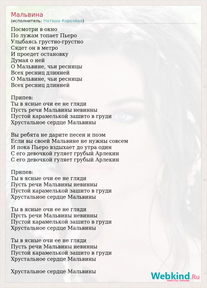 Посмотри в окно По лужам топает Пьеро Улыбаясь грустно-грустно Сядет он в метро И проедет остановку Думая о ней О Мальвине, чьи ресницы Всех ресниц длинней О Мальвине, чьи ресницы Всех ресниц длинней Припев: Ты в ясные очи ее не гляди Пусть речи Мальвины невинны Пустой карамелькой зашито в груди Хрустальное сердце Мальвины Вы ребята не дарите песен и поэм Если вы своей Мальвине не нужны совсем И пока Пьеро вздыхает до утра один С его девочкой гуляет грубый Арлекин С его девочкой гуляет грубый Арлекин Припев: Ты в ясные очи ее не гляди Пусть речи Мальвины невинны Пустой карамелькой зашито в груди Хрустальное сердце Мальвины Ты в ясные очи ее не гляди Пусть речи Мальвины невинны Пустой карамелькой зашито в груди Хрустальное сердце Мальвины Ты в ясные очи ее не гляди Пусть речи Мальвины невинны Пустой карамелькой зашито в груди Хрустальное сердце Мальвины Хрустальное сердце Мальвины
