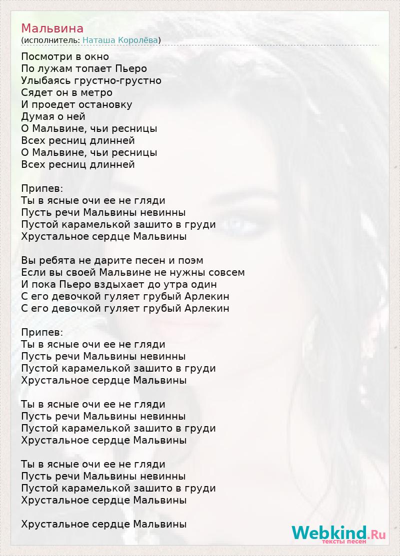 Посмотри в окно По лужам топает Пьеро Улыбаясь грустно-грустно Сядет он в метро И проедет остановку Думая о ней О Мальвине, чьи ресницы Всех ресниц длинней О Мальвине, чьи ресницы Всех ресниц длинней Припев: Ты в ясные очи ее не гляди Пусть речи Мальвины невинны Пустой карамелькой зашито в груди Хрустальное сердце Мальвины Вы ребята не дарите песен и поэм Если вы своей Мальвине не нужны совсем И пока Пьеро вздыхает до утра один С его девочкой гуляет грубый Арлекин С его девочкой гуляет грубый Арлекин Припев: Ты в ясные очи ее не гляди Пусть речи Мальвины невинны Пустой карамелькой зашито в груди Хрустальное сердце Мальвины Ты в ясные очи ее не гляди Пусть речи Мальвины невинны Пустой карамелькой зашито в груди Хрустальное сердце Мальвины Ты в ясные очи ее не гляди Пусть речи Мальвины невинны Пустой карамелькой зашито в груди Хрустальное сердце Мальвины Хрустальное сердце Мальвины