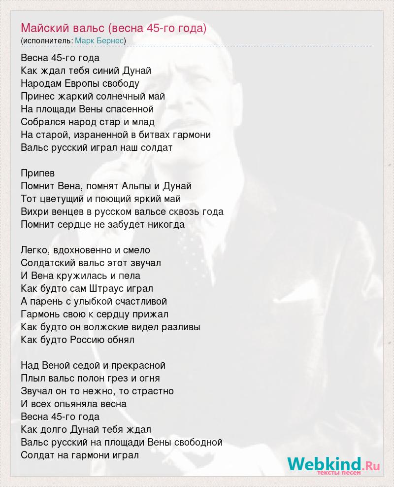 Весна 45-го года Как ждал тебя синий Дунай Народам Европы свободу Принес жаркий солнечный май На площади Вены спасенной Собрался народ стар и млад На старой, израненной в битвах гармони Вальс русский играл наш солдат Припев Помнит Вена, помнят Альпы и Дунай Тот цветущий и поющий яркий май Вихри венцев в русском вальсе сквозь года Помнит сердце не забудет никогда Легко, вдохновенно и смело Солдатский вальс этот звучал И Вена кружилась и пела Как будто сам Штраус играл А парень с улыбкой счастливой Гармонь свою к сердцу прижал Как будто он волжские видел разливы Как будто Россию обнял Над Веной седой и прекрасной Плыл вальс полон грез и огня Звучал он то нежно, то страстно И всех опьяняла весна Весна 45-го года Как долго Дунай тебя ждал Вальс русский на площади Вены свободной Солдат на гармони играл