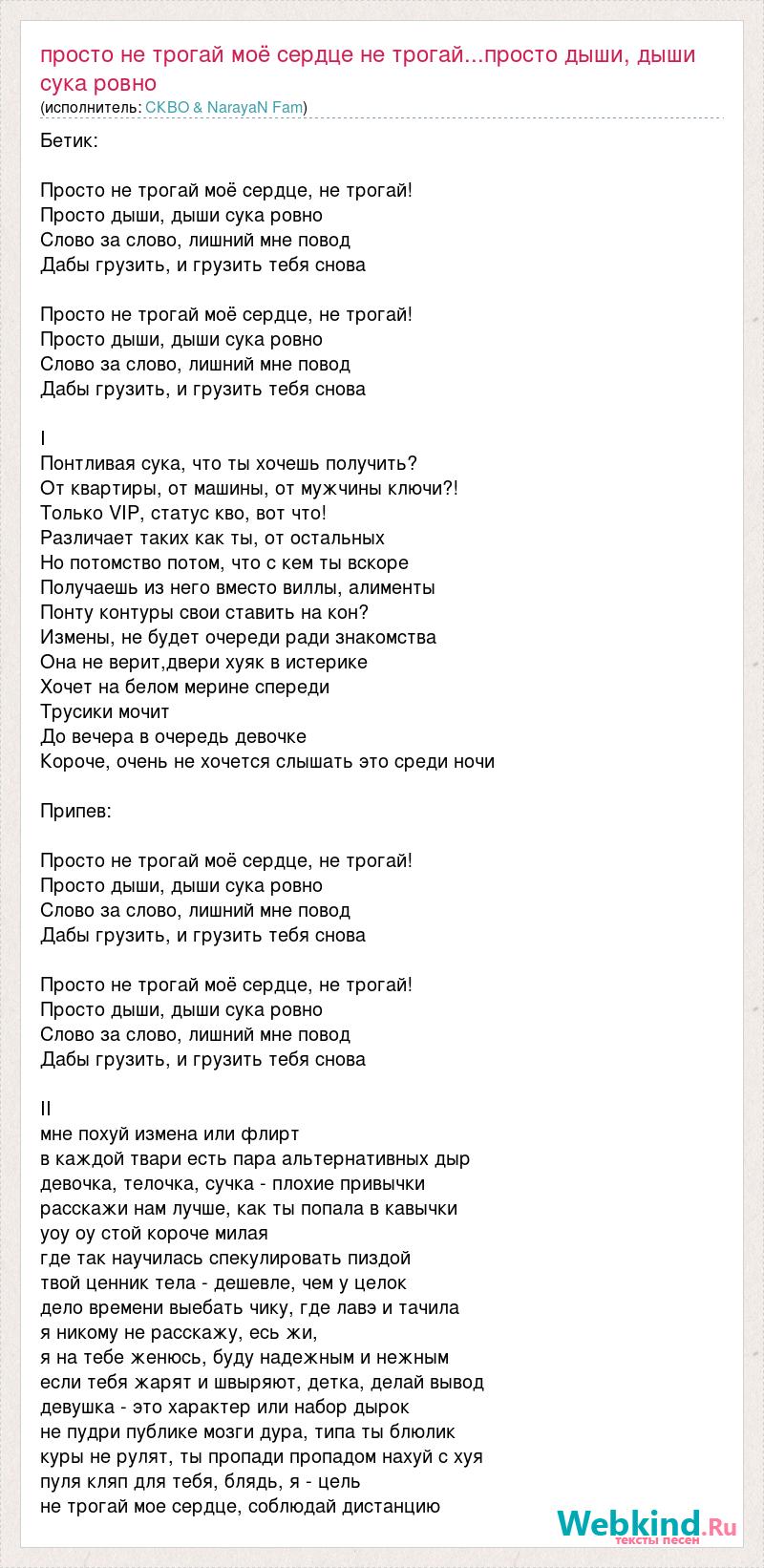 Бетик: Просто не трогай моё сердце, не трогай! Просто дыши, дыши сука ровно Слово за слово, лишний мне повод Дабы грузить, и грузить тебя снова Просто не трогай моё сердце, не трогай! Просто дыши, дыши сука ровно Слово за слово, лишний мне повод Дабы грузить, и грузить тебя снова I Понтливая сука, что ты хочешь получить? От квартиры, от машины, от мужчины ключи?! Только VIP, статус кво, вот что! Различает таких как ты, от остальных Но потомство потом, что с кем ты вскоре Получаешь из него вместо виллы, алименты Понту контуры свои ставить на кон? Измены, не будет очереди ради знакомства Она не верит,двери хуяк в истерике Хочет на белом мерине спереди Трусики мочит До вечера в очередь девочке Короче, очень не хочется слышать это среди ночи Припев: Просто не трогай моё сердце, не трогай! Просто дыши, дыши сука ровно Слово за слово, лишний мне повод Дабы грузить, и грузить тебя снова Просто не трогай моё сердце, не трогай! Просто дыши, дыши сука ровно Слово за слово, лишний мне повод Дабы грузить, и грузить тебя снова II мне похуй измена или флирт в каждой твари есть пара альтернативных дыр девочка, телочка, сучка - плохие привычки расскажи нам лучше, как ты попала в кавычки уоу оу стой короче милая где так научилась спекулировать пиздой твой ценник тела - дешевле, чем у целок дело времени выебать чику, где лавэ и тачила я никому не расскажу, есь жи, я на тебе женюсь, буду надежным и нежным если тебя жарят и швыряют, детка, делай вывод девушка - это характер или набор дырок не пудри публике мозги дура, типа ты блюлик куры не рулят, ты пропади пропадом нахуй с хуя пуля кляп для тебя, блядь, я - цель не трогай мое сердце, соблюдай дистанцию