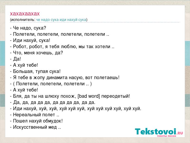 - Че надо, сука? - Полетели, полетели, полетели, полетели .. - Иди нахуй, сука! - Робот, робот, я тебя люблю, мы так хотели .. - Что, меня хочешь, да? - Да! - А хуй тебе! - Большая, тупая сука! - Я тебе в жопу динамита насую, вот полетаешь! - ( Полетели, полетели, полетели .. ) - А хуй тебе! - Бля, да ты на шлюху похож, [bad word] переодетый! - Да, да, да да да, да да да да, да да. - Иди нахуй, хуй, хуй, хуй хуй хуй, хуй хуй хуй хуй, хуй хуй. - Нереальный полет .. - Пошел нахуй обмудок! - Искусственный мед ..