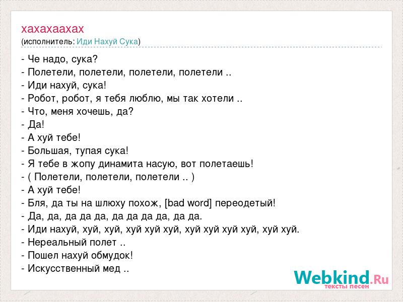 - Че надо, сука? - Полетели, полетели, полетели, полетели .. - Иди нахуй, сука! - Робот, робот, я тебя люблю, мы так хотели .. - Что, меня хочешь, да? - Да! - А хуй тебе! - Большая, тупая сука! - Я тебе в жопу динамита насую, вот полетаешь! - ( Полетели, полетели, полетели .. ) - А хуй тебе! - Бля, да ты на шлюху похож, [bad word] переодетый! - Да, да, да да да, да да да да, да да. - Иди нахуй, хуй, хуй, хуй хуй хуй, хуй хуй хуй хуй, хуй хуй. - Нереальный полет .. - Пошел нахуй обмудок! - Искусственный мед ..