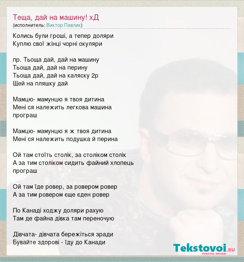 Колись були гроші, а тепер доляри Куплю свої жінці чорні окуляри пр. Тьоща дай, дай на машину Тьоща дай, дай на перину Тьоща дай, дай на каляску 2р Щей на пляшку дай Мамцю- мамунцю я твоя дитина Мені ся належить легкова машина програш Мамцю- мамунцю я ж твоя дитина Мені ся належить подушка й перина Ой там стоїть столік, за століком столік А за тим століком сидить файний хлопець програш Ой там їде ровер, за ровером ровер А за тим ровером єще єден ровер По Канаді ходжу доляри рахую Там де файна дівка там переночую Дівчата- дівчата бережіться зради Бувайте здорові - їду до Канади