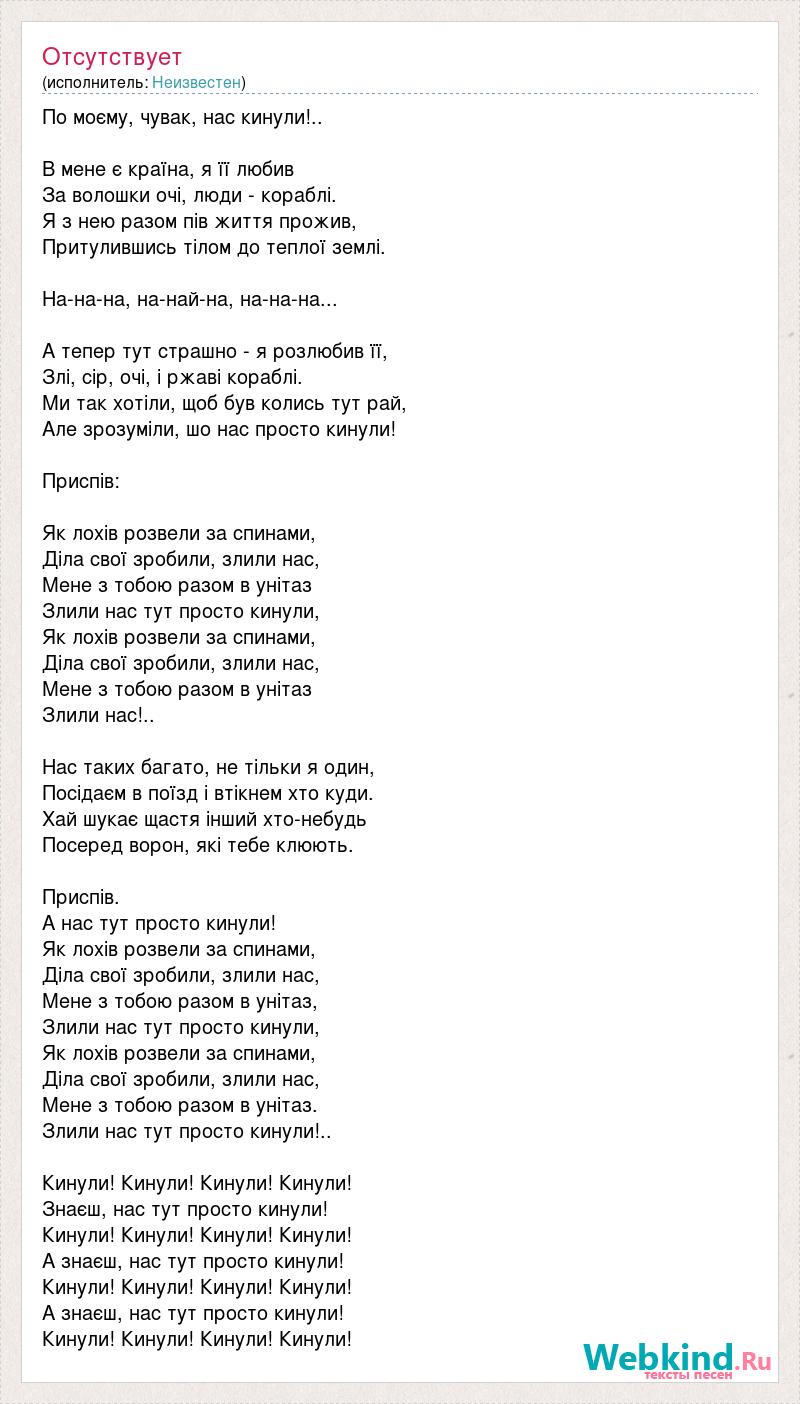 По моєму, чувак, нас кинули!.. В мене є країна, я її любив За волошки очі, люди - кораблі. Я з нею разом пів життя прожив, Притулившись тілом до теплої землі. На-на-на, на-най-на, на-на-на... А тепер тут страшно - я розлюбив її, Злі, сір, очі, і ржаві кораблі. Ми так хотіли, щоб був колись тут рай, Але зрозуміли, шо нас просто кинули! Приспів: Як лохів розвели за спинами, Діла свої зробили, злили нас, Мене з тобою разом в унітаз Злили нас тут просто кинули, Як лохів розвели за спинами, Діла свої зробили, злили нас, Мене з тобою разом в унітаз Злили нас!.. Нас таких багато, не тільки я один, Посідаєм в поїзд і втікнем хто куди. Хай шукає щастя інший хто-небудь Посеред ворон, які тебе клюють. Приспів. А нас тут просто кинули! Як лохів розвели за спинами, Діла свої зробили, злили нас, Мене з тобою разом в унітаз, Злили нас тут просто кинули, Як лохів розвели за спинами, Діла свої зробили, злили нас, Мене з тобою разом в унітаз. Злили нас тут просто кинули!.. Кинули! Кинули! Кинули! Кинули! Знаєш, нас тут просто кинули! Кинули! Кинули! Кинули! Кинули! А знаєш, нас тут просто кинули! Кинули! Кинули! Кинули! Кинули! А знаєш, нас тут просто кинули! Кинули! Кинули! Кинули! Кинули!