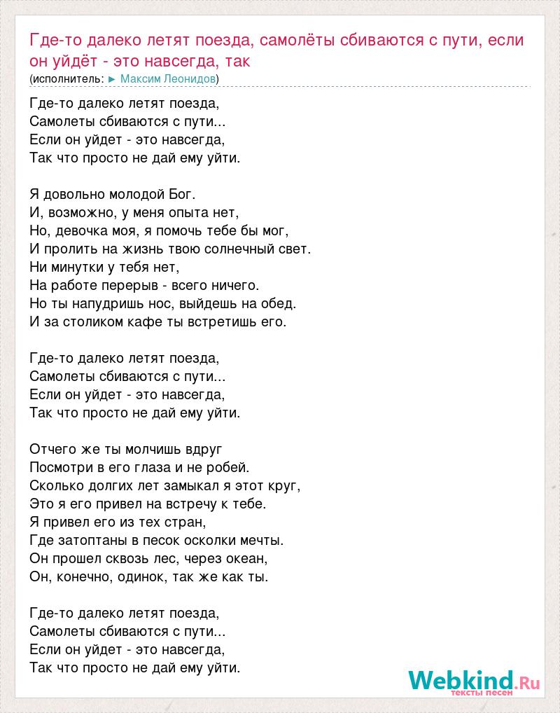 Главная→Исполнители→► Максим Леонидов→Где-то далеко летят поезда, самолёты сбиваются с пути, если он уйдёт - это навсе