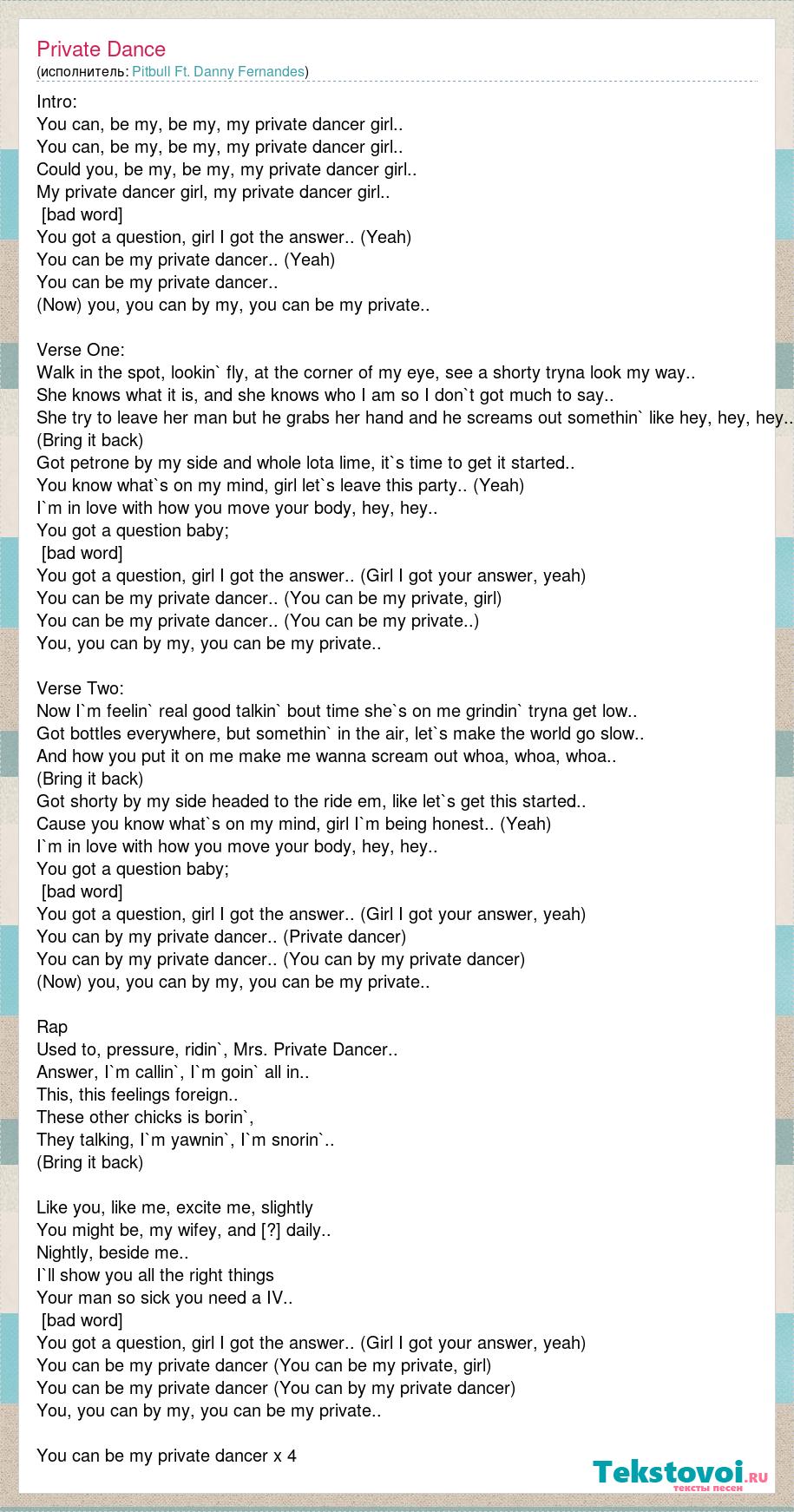 Intro: You can, be my, be my, my private dancer girl.. You can, be my, be my, my private dancer girl.. Could you, be my, be my, my private dancer girl.. My private dancer girl, my private dancer girl.. Chorus: You got a question, girl I got the answer.. (Yeah) You can be my private dancer.. (Yeah) You can be my private dancer.. (Now) you, you can by my, you can be my private.. Verse One: Walk in the spot, lookin` fly, at the corner of my eye, see a shorty tryna look my way.. She knows what it is, and she knows who I am so I don`t got much to say.. She try to leave her man but he grabs her hand and he screams out somethin` like hey, hey, hey.. (Bring it back) Got petrone by my side and whole lota lime, it`s time to get it started.. You know what`s on my mind, girl let`s leave this party.. (Yeah) I`m in love with how you move your body, hey, hey.. You got a question baby; Chorus: You got a question, girl I got the answer.. (Girl I got your answer, yeah) You can be my private dancer.. (You can be my private, girl) You can be my private dancer.. (You can be my private..) You, you can by my, you can be my private.. Verse Two: Now I`m feelin` real good talkin` bout time she`s on me grindin` tryna get low.. Got bottles everywhere, but somethin` in the air, let`s make the world go slow.. And how you put it on me make me wanna scream out whoa, whoa, whoa.. (Bring it back) Got shorty by my side headed to the ride em, like let`s get this started.. Cause you know what`s on my mind, girl I`m being honest.. (Yeah) I`m in love with how you move your body, hey, hey.. You got a question baby; Chorus: You got a question, girl I got the answer.. (Girl I got your answer, yeah) You can by my private dancer.. (Private dancer) You can by my private dancer.. (You can by my private dancer) (Now) you, you can by my, you can be my private.. Rap Used to, pressure, ridin`, Mrs. Private Dancer.. Answer, I`m callin`, I`m goin` all in.. This, this feelings foreign.. These other chicks is borin`, They talking, I`m yawnin`, I`m snorin`.. (Bring it back) Like you, like me, excite me, slightly You might be, my wifey, and [?] daily.. Nightly, beside me.. I`ll show you all the right things Your man so sick you need a IV.. Chorus: You got a question, girl I got the answer.. (Girl I got your answer, yeah) You can be my private dancer (You can be my private, girl) You can be my private dancer (You can by my private dancer) You, you can by my, you can be my private.. You can be my private dancer x 4