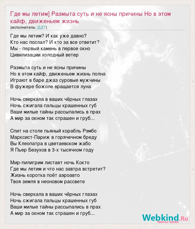 Где мы летим] Размыта суть и не ясны причины Но в этом кайф, движеньем жизнь