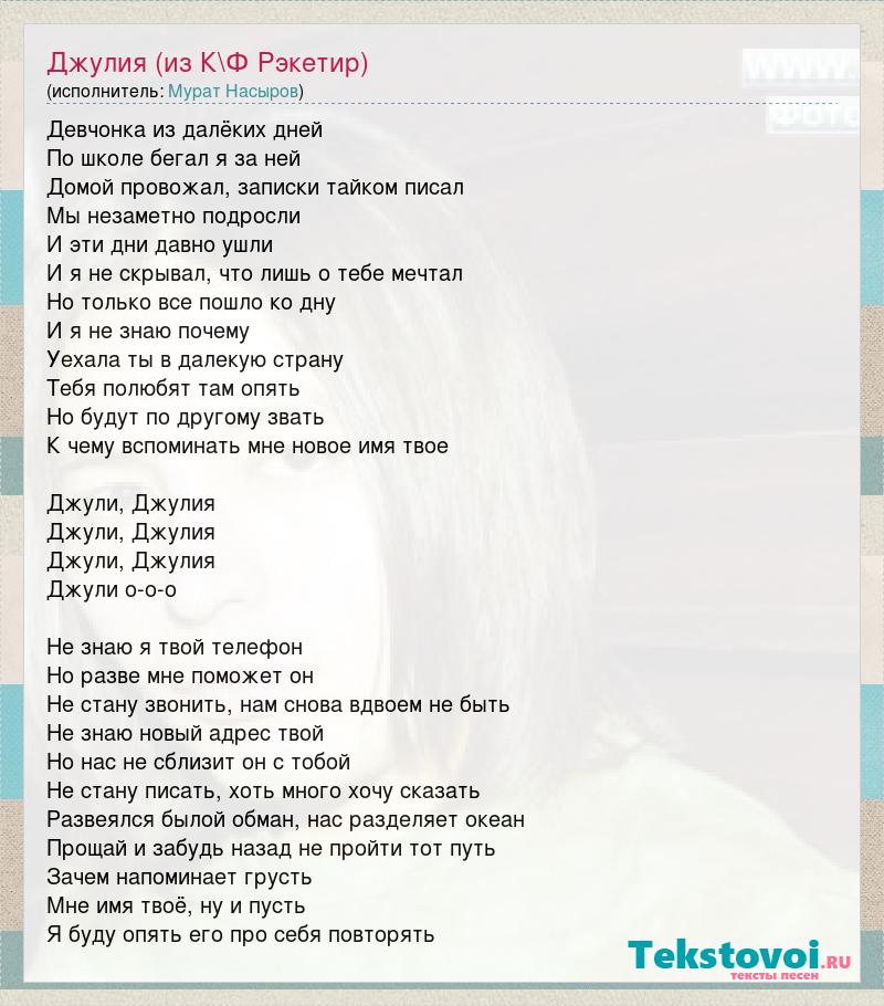 Девчонка из далёких дней По школе бегал я за ней Домой провожал, записки тайком писал Мы незаметно подросли И эти дни давно ушли И я не скрывал, что лишь о тебе мечтал Но только все пошло ко дну И я не знаю почему Уехала ты в далекую страну Тебя полюбят там опять Но будут по другому звать К чему вспоминать мне новое имя твое Джули, Джулия Джули, Джулия Джули, Джулия Джули о-о-о Не знаю я твой телефон Но разве мне поможет он Не стану звонить, нам снова вдвоем не быть Не знаю новый адрес твой Но нас не сблизит он с тобой Не стану писать, хоть много хочу сказать Развеялся былой обман, нас разделяет океан Прощай и забудь назад не пройти тот путь Зачем напоминает грусть Мне имя твоё, ну и пусть Я буду опять его про себя повторять
