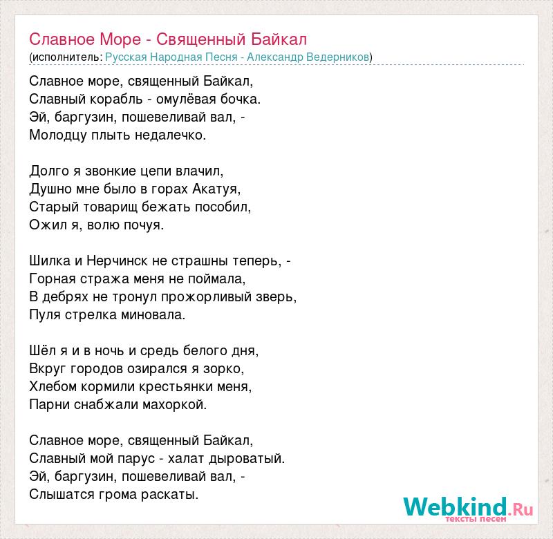Славное море, священный Байкал, Славный корабль - омулёвая бочка. Эй, баргузин, пошевеливай вал, - Молодцу плыть недалечко. Долго я звонкие цепи влачил, Душно мне было в горах Акатуя, Старый товарищ бежать пособил, Ожил я, волю почуя. Шилка и Нерчинск не страшны теперь, - Горная стража меня не поймала, В дебрях не тронул прожорливый зверь, Пуля стрелка миновала. Шёл я и в ночь и средь белого дня, Вкруг городов озирался я зорко, Хлебом кормили крестьянки меня, Парни снабжали махоркой. Славное море, священный Байкал, Славный мой парус - халат дыроватый. Эй, баргузин, пошевеливай вал, - Слышатся грома раскаты.