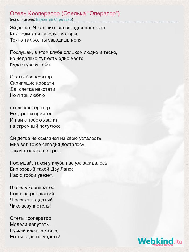 Эй детка, Я как никогда сегодня раскован Как водители заводят моторы, Точно так же ты заводишь меня. Послушай, в этом клубе слишком людно и тесно, но недалеко тут есть одно место Куда я увезу тебя. Отель Кооператор Скрипящие кровати Да, слегка некстати Но я так люблю отель кооператор Недорог и приятен И нам с тобою хватит на скромный полулюкс. Эй детка не ссылайся на свою усталость Мне вот тоже сегодня досталось, такая отмазка не прет. Послушай, такси у клуба нас уж заждалось Бирюзовый такой Дэу Ланос Нас с тобой увезет. В отель кооператор После мероприятий Я слегка поддатый Чикс везу в отель! Отель кооператор Модели депутаты Пускай висят в хаяте, Но ты ведь не модель!