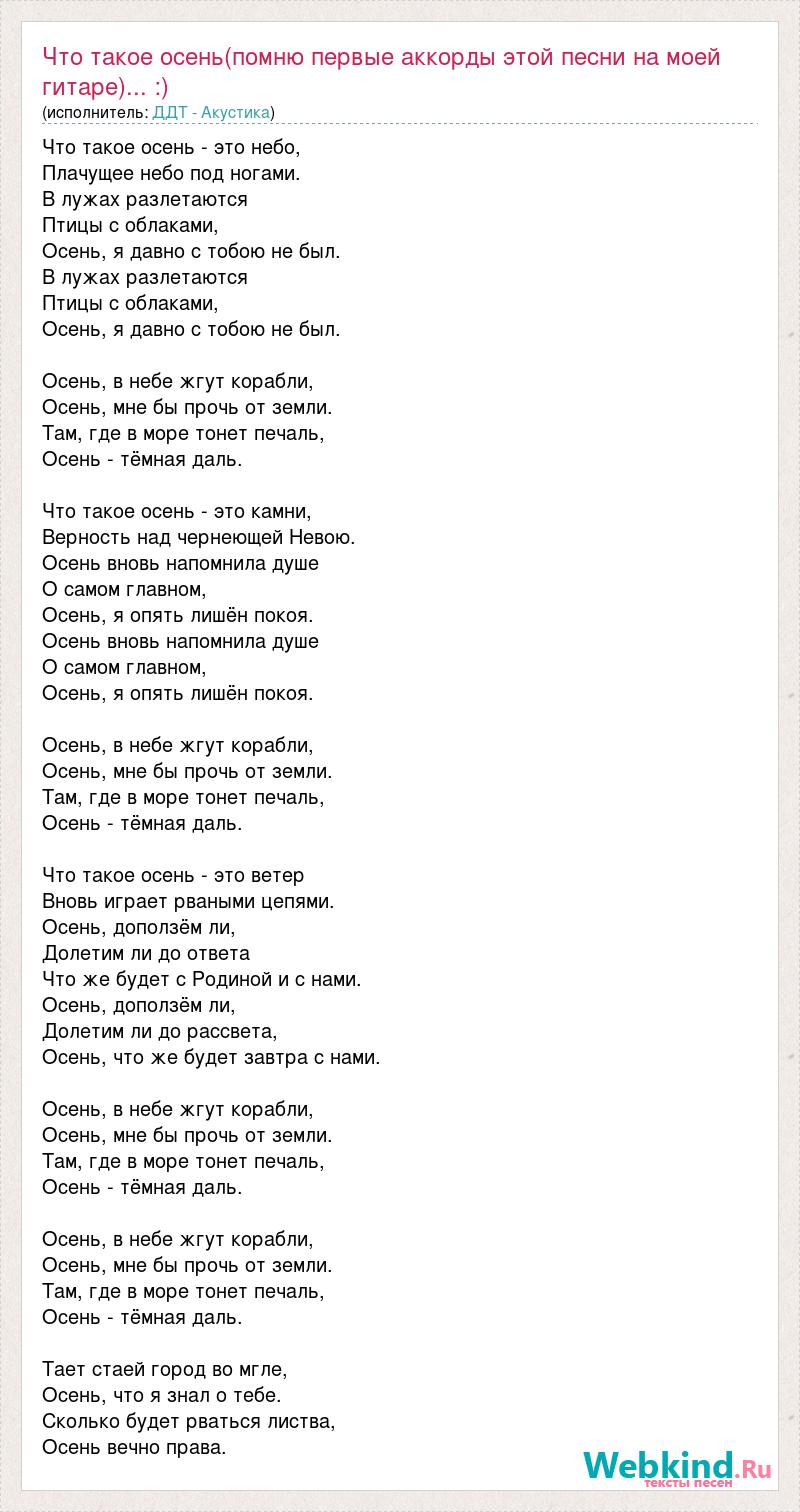 Что такое осень - это небо, Плачущее небо под ногами. В лужах разлетаются Птицы с облаками, Осень, я давно с тобою не был. В лужах разлетаются Птицы с облаками, Осень, я давно с тобою не был. Осень, в небе жгут корабли, Осень, мне бы прочь от земли. Там, где в море тонет печаль, Осень - тёмная даль. Что такое осень - это камни, Верность над чернеющей Невою. Осень вновь напомнила душе О самом главном, Осень, я опять лишён покоя. Осень вновь напомнила душе О самом главном, Осень, я опять лишён покоя. Осень, в небе жгут корабли, Осень, мне бы прочь от земли. Там, где в море тонет печаль, Осень - тёмная даль. Что такое осень - это ветер Вновь играет рваными цепями. Осень, доползём ли, Долетим ли до ответа Что же будет с Родиной и с нами. Осень, доползём ли, Долетим ли до рассвета, Осень, что же будет завтра с нами. Осень, в небе жгут корабли, Осень, мне бы прочь от земли. Там, где в море тонет печаль, Осень - тёмная даль. Осень, в небе жгут корабли, Осень, мне бы прочь от земли. Там, где в море тонет печаль, Осень - тёмная даль. Тает стаей город во мгле, Осень, что я знал о тебе. Сколько будет рваться листва, Осень вечно права.