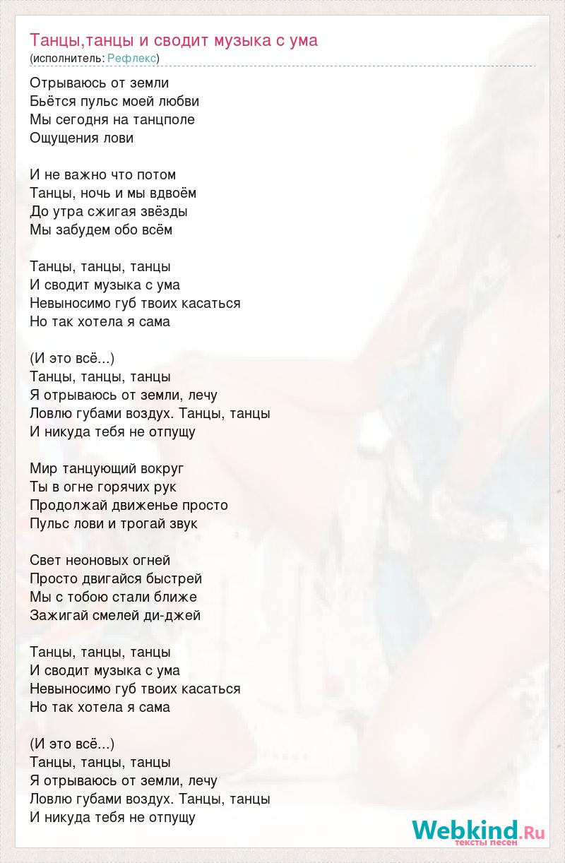 Отрываюсь от земли Бьётся пульс моей любви Мы сегодня на танцполе Ощущения лови И не важно что потом Танцы, ночь и мы вдвоём До утра сжигая звёзды Мы забудем обо всём Танцы, танцы, танцы И сводит музыка с ума Невыносимо губ твоих касаться Но так хотела я сама (И это всё...) Танцы, танцы, танцы Я отрываюсь от земли, лечу Ловлю губами воздух. Танцы, танцы И никуда тебя не отпущу Мир танцующий вокруг Ты в огне горячих рук Продолжай движенье просто Пульс лови и трогай звук Свет неоновых огней Просто двигайся быстрей Мы с тобою стали ближе Зажигай смелей ди-джей Танцы, танцы, танцы И сводит музыка с ума Невыносимо губ твоих касаться Но так хотела я сама (И это всё...) Танцы, танцы, танцы Я отрываюсь от земли, лечу Ловлю губами воздух. Танцы, танцы И никуда тебя не отпущу