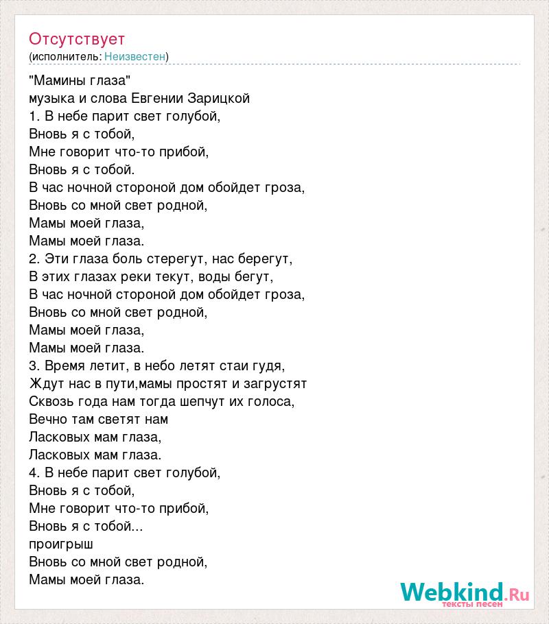 "Мамины глаза" музыка и слова Евгении Зарицкой 1. В небе парит свет голубой, Вновь я с тобой, Мне говорит что-то прибой, Вновь я с тобой. В час ночной стороной дом обойдет гроза, Вновь со мной свет родной, Мамы моей глаза, Мамы моей глаза. 2. Эти глаза боль стерегут, нас берегут, В этих глазах реки текут, воды бегут, В час ночной стороной дом обойдет гроза, Вновь со мной свет родной, Мамы моей глаза, Мамы моей глаза. 3. Время летит, в небо летят стаи гудя, Ждут нас в пути,мамы простят и загрустят Сквозь года нам тогда шепчут их голоса, Вечно там светят нам Ласковых мам глаза, Ласковых мам глаза. 4. В небе парит свет голубой, Вновь я с тобой, Мне говорит что-то прибой, Вновь я с тобой... проигрыш Вновь со мной свет родной, Мамы моей глаза.