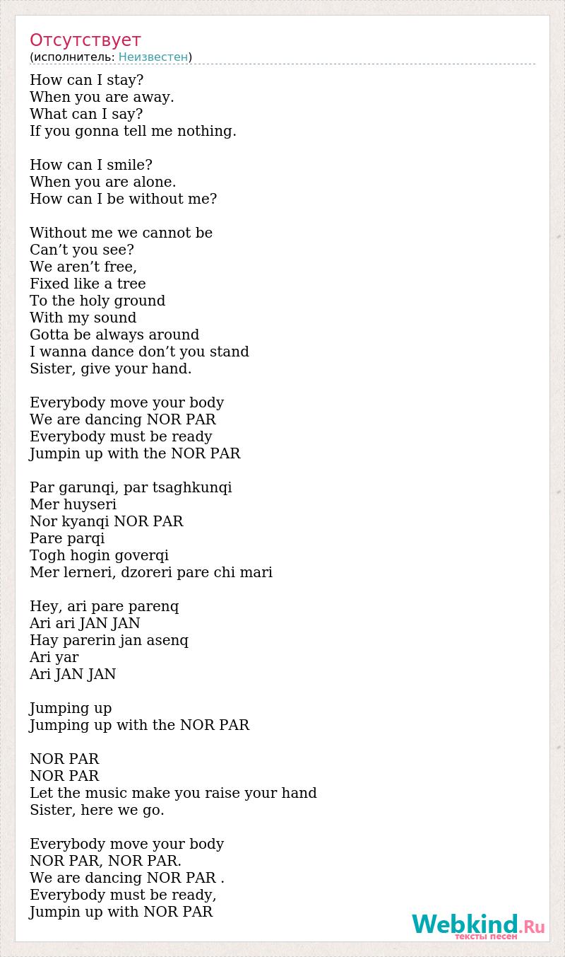 How can I stay? When you are away. What can I say? If you gonna tell me nothing. How can I smile? When you are alone. How can I be without me? Without me we cannot be Can’t you see? We aren’t free, Fixed like a tree To the holy ground With my sound Gotta be always around I wanna dance don’t you stand Sister, give your hand. Everybody move your body We are dancing NOR PAR Everybody must be ready Jumpin up with the NOR PAR Par garunqi, par tsaghkunqi Mer huyseri Nor kyanqi NOR PAR Pare parqi Togh hogin goverqi Mer lerneri, dzoreri pare chi mari Hey, ari pare parenq Ari ari JAN JAN Hay parerin jan asenq Ari yar Ari JAN JAN Jumping up Jumping up with the NOR PAR NOR PAR NOR PAR Let the music make you raise your hand Sister, here we go. Everybody move your body NOR PAR, NOR PAR. We are dancing NOR PAR . Everybody must be ready, Jumpin up with NOR PAR