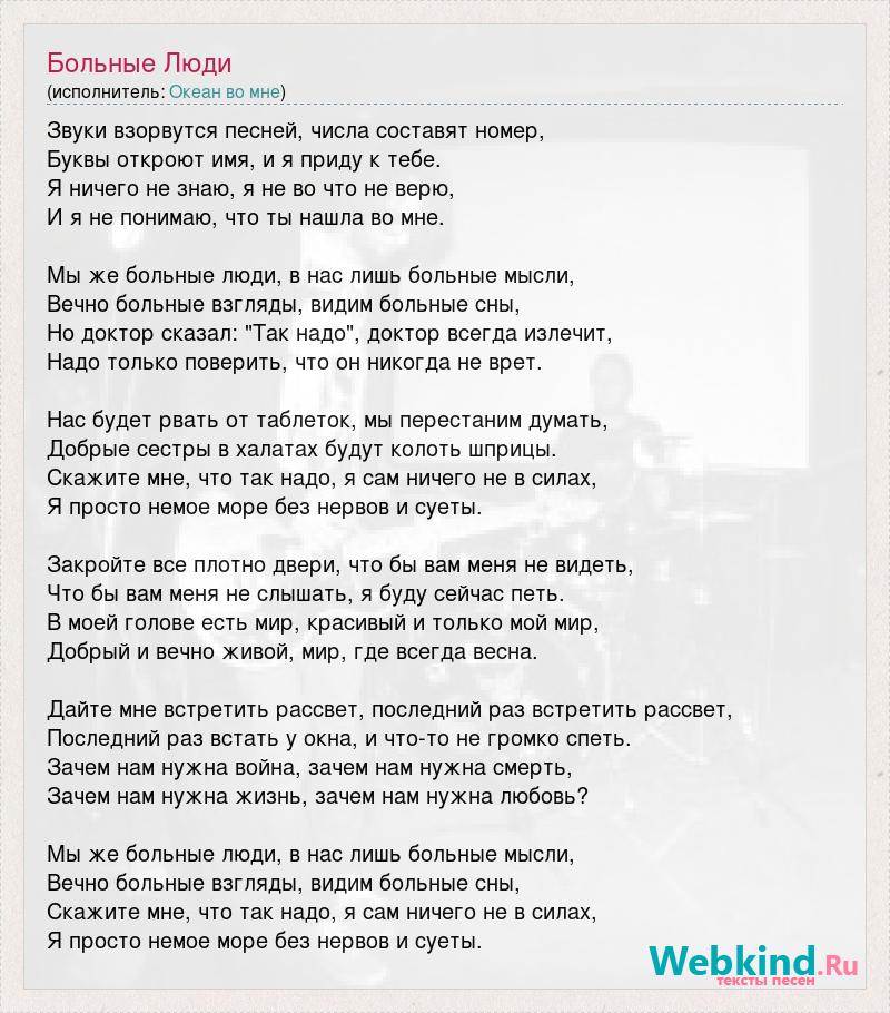 Звуки взорвутся песней, числа составят номер, Буквы откроют имя, и я приду к тебе. Я ничего не знаю, я не во что не верю, И я не понимаю, что ты нашла во мне. Мы же больные люди, в нас лишь больные мысли, Вечно больные взгляды, видим больные сны, Но доктор сказал: "Так надо", доктор всегда излечит, Надо только поверить, что он никогда не врет. Нас будет рвать от таблеток, мы перестаним думать, Добрые сестры в халатах будут колоть шприцы. Скажите мне, что так надо, я сам ничего не в силах, Я просто немое море без нервов и суеты. Закройте все плотно двери, что бы вам меня не видеть, Что бы вам меня не слышать, я буду сейчас петь. В моей голове есть мир, красивый и только мой мир, Добрый и вечно живой, мир, где всегда весна. Дайте мне встретить рассвет, последний раз встретить рассвет, Последний раз встать у окна, и что-то не громко спеть. Зачем нам нужна война, зачем нам нужна смерть, Зачем нам нужна жизнь, зачем нам нужна любовь? Мы же больные люди, в нас лишь больные мысли, Вечно больные взгляды, видим больные сны, Скажите мне, что так надо, я сам ничего не в силах, Я просто немое море без нервов и суеты.