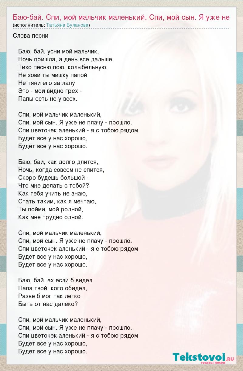 Слова песни Баю, бай, усни мой мальчик, Ночь пришла, а день все дальше, Тихо песню пою, колыбельную. Не зови ты мишку папой Не тяни его за лапу Это - мой видно грех - Папы есть не у всех. Спи, мой мальчик маленький, Спи, мой сын. Я уже не плачу - прошло. Спи цветочек аленький - я с тобою рядом Будет все у нас хорошо, Будет все у нас хорошо. Баю, бай, как долго длится, Ночь, когда совсем не спится, Скоро будешь большой - Что мне делать с тобой? Как тебя учить не знаю, Стать таким, как я мечтаю, Ты пойми, мой родной, Как мне трудно одной. Спи, мой мальчик маленький, Спи, мой сын. Я уже не плачу - прошло. Спи цветочек аленький - я с тобою рядом Будет все у нас хорошо, Будет все у нас хорошо. Баю, бай, ах если б видел Папа твой, кого обидел, Разве б мог так легко Быть от нас далеко? Спи, мой мальчик маленький, Спи, мой сын. Я уже не плачу - прошло. Спи цветочек аленький - я с тобою рядом Будет все у нас хорошо, Будет все у нас хорошо.