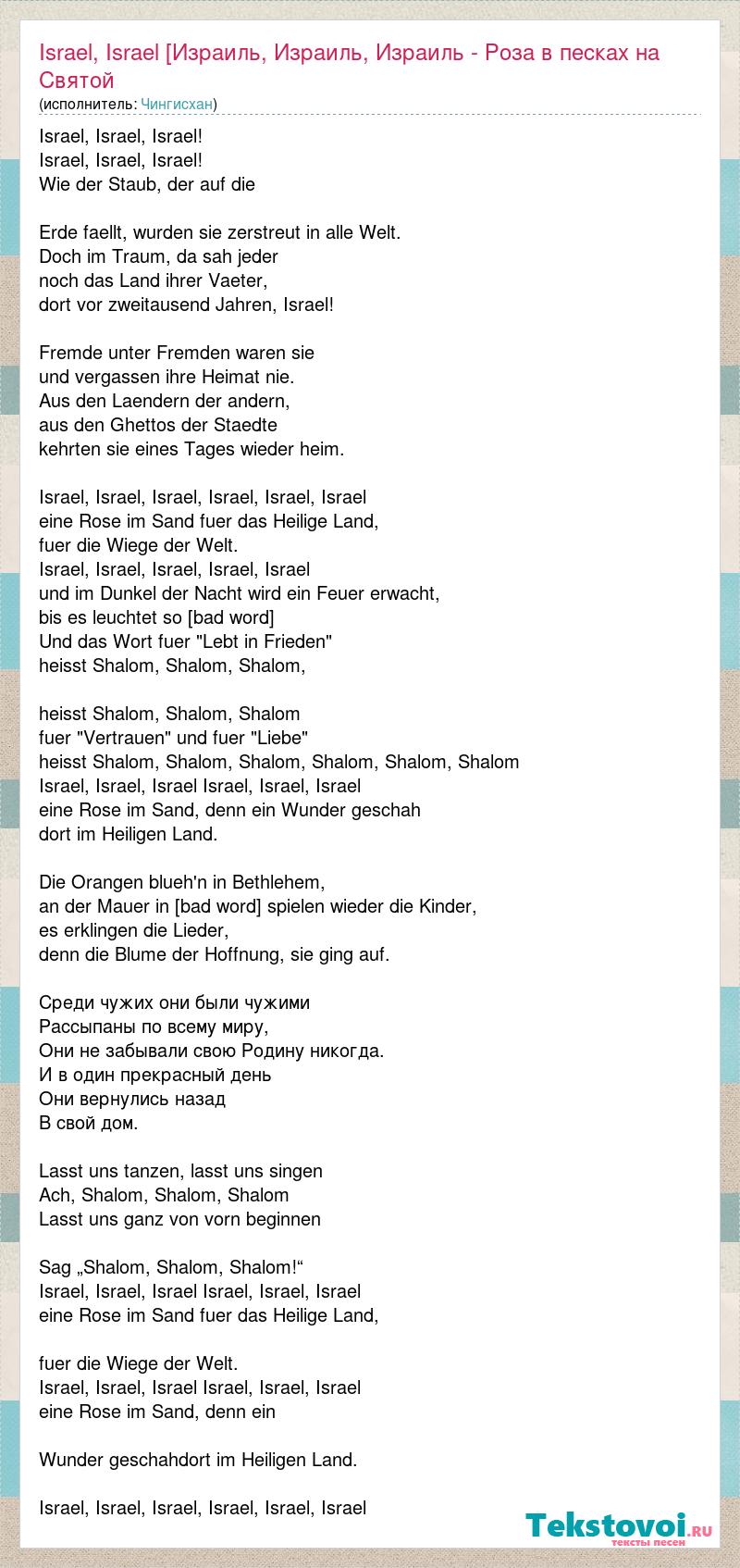 Israel, Israel, Israel! Israel, Israel, Israel! Wie der Staub, der auf die Erde faellt, wurden sie zerstreut in alle Welt. Doch im Traum, da sah jeder noch das Land ihrer Vaeter, dort vor zweitausend Jahren, Israel! Fremde unter Fremden waren sie und vergassen ihre Heimat nie. Aus den Laendern der andern, aus den Ghettos der Staedte kehrten sie eines Tages wieder heim. Israel, Israel, Israel, Israel, Israel, Israel eine Rose im Sand fuer das Heilige Land, fuer die Wiege der Welt. Israel, Israel, Israel, Israel, Israel und im Dunkel der Nacht wird ein Feuer erwacht, bis es leuchtet so hell. Und das Wort fuer "Lebt in Frieden" heisst Shalom, Shalom, Shalom, heisst Shalom, Shalom, Shalom fuer "Vertrauen" und fuer "Liebe" heisst Shalom, Shalom, Shalom, Shalom, Shalom, Shalom Israel, Israel, Israel Israel, Israel, Israel eine Rose im Sand, denn ein Wunder geschah dort im Heiligen Land. Die Orangen blueh'n in Bethlehem, an der Mauer in Jerusalem spielen wieder die Kinder, es erklingen die Lieder, denn die Blume der Hoffnung, sie ging auf. Среди чужих они были чужими Рассыпаны по всему миру, Они не забывали свою Родину никогда. И в один прекрасный день Они вернулись назад В свой дом. Lasst uns tanzen, lasst uns singen Ach, Shalom, Shalom, Shalom Lasst uns ganz von vorn beginnen Sag „Shalom, Shalom, Shalom!“ Israel, Israel, Israel Israel, Israel, Israel eine Rose im Sand fuer das Heilige Land, fuer die Wiege der Welt. Israel, Israel, Israel Israel, Israel, Israel eine Rose im Sand, denn ein Wunder geschahdort im Heiligen Land. Israel, Israel, Israel, Israel, Israel, Israel