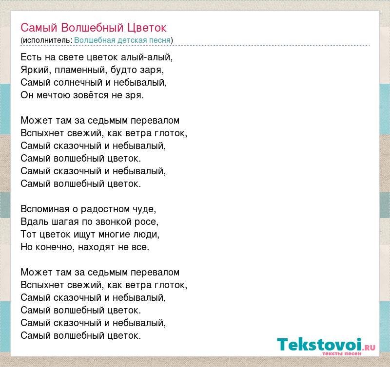 Есть на свете цветок алый-алый, Яркий, пламенный, будто заря, Самый солнечный и небывалый, Он мечтою зовётся не зря. Может там за седьмым перевалом Вспыхнет свежий, как ветра глоток, Самый сказочный и небывалый, Самый волшебный цветок. Самый сказочный и небывалый, Самый волшебный цветок. Вспоминая о радостном чуде, Вдаль шагая по звонкой росе, Тот цветок ищут многие люди, Но конечно, находят не все. Может там за седьмым перевалом Вспыхнет свежий, как ветра глоток, Самый сказочный и небывалый, Самый волшебный цветок. Самый сказочный и небывалый, Самый волшебный цветок.