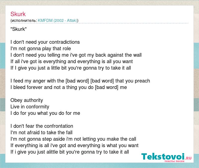 "Skurk" I don't need your contradictions I'm not gonna play that role I don't need you telling me i've got my back against the wall If all i've got is everything and everything is all you want If I give you just a little bit you're gonna try to take it all I feed my anger with the [bad word] [bad word] that you preach I bleed forever and not a thing you do can comfort me Obey authority Live in conformity I do for you what you do for me I don't fear the confrontation I'm not afraid to take the fall I'm not gonna step aside i'm not letting you make the call If everything is all i've got and everything is what you want If i give you just alittle bit you're gonna try to take it all