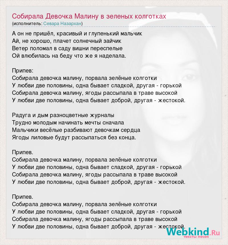 А он не пришёл, красивый и глупенький мальчик Ай, не хорошо, плачет солнечный зайчик Ветер поломал в саду вишни переспелые Ой влюбилась на беду что же я наделала. Припев: Собирала девочка малину, порвала зелёные колготки У любви две половины, одна бывает сладкой, другая - горькой Собирала девочка малину, ягоды рассыпала в траве высокой У любви две половины, одна бывает доброй, другая - жестокой. Радуга и дым разноцветные журналы Трудно молодым начинать мечты сначала Мальчики весёлые разбивают девочкам сердца Ягоды лиловые будут рассыпаться без конца. Припев. Собирала девочка малину, порвала зелёные колготки У любви две половины, одна бывает сладкой, другая - горькой Собирала девочка малину, ягоды рассыпала в траве высокой У любви две половины, одна бывает доброй, другая - жестокой. Припев. Собирала девочка малину, порвала зелёные колготки У любви две половины, одна бывает сладкой, другая - горькой Собирала девочка малину, ягоды рассыпала в траве высокой У любви две половины, одна бывает доброй, другая - жестокой.