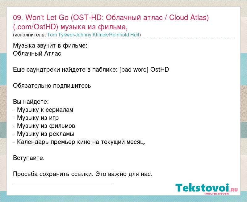 Главная→Исполнители→Tom Tykwer/Johnny Klimek/Reinhold Heil→09. Won't Let Go (OST-HD: Облачный атлас / Cloud Atlas) (.com/OstHD) музыка из ф