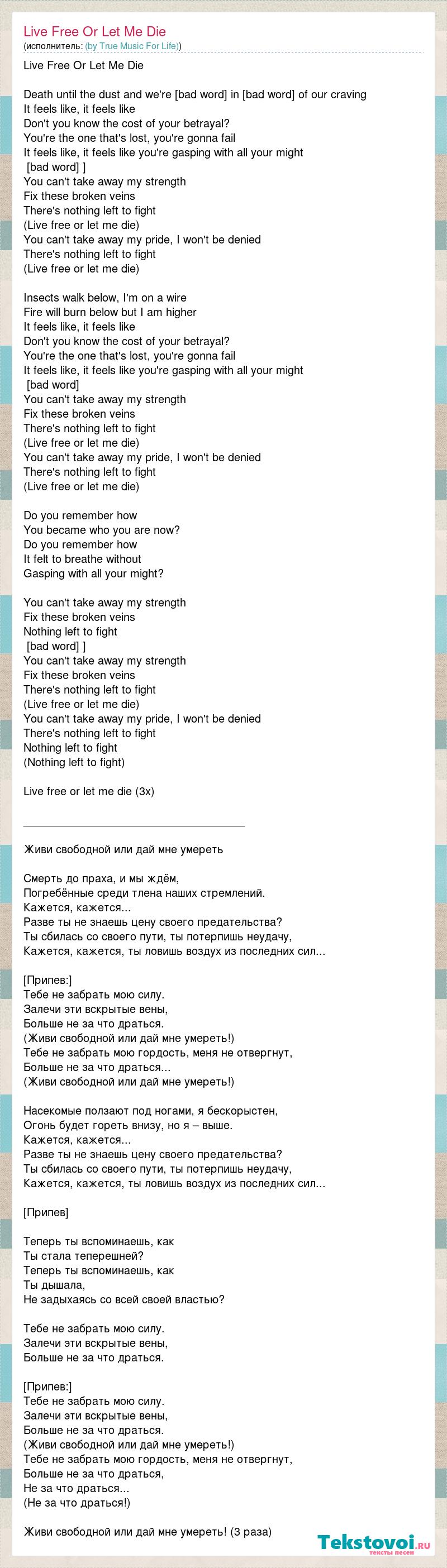 Live Free Or Let Me Die Death until the dust and we're waiting Ruined in the rust of our craving It feels like, it feels like Don't you know the cost of your betrayal? You're the one that's lost, you're gonna fail It feels like, it feels like you're gasping with all your might [Chorus:] You can't take away my strength Fix these broken veins There's nothing left to fight (Live free or let me die) You can't take away my pride, I won't be denied There's nothing left to fight (Live free or let me die) Insects walk below, I'm on a wire Fire will burn below but I am higher It feels like, it feels like Don't you know the cost of your betrayal? You're the one that's lost, you're gonna fail It feels like, it feels like you're gasping with all your might [Chorus] You can't take away my strength Fix these broken veins There's nothing left to fight (Live free or let me die) You can't take away my pride, I won't be denied There's nothing left to fight (Live free or let me die) Do you remember how You became who you are now? Do you remember how It felt to breathe without Gasping with all your might? You can't take away my strength Fix these broken veins Nothing left to fight [Chorus:] You can't take away my strength Fix these broken veins There's nothing left to fight (Live free or let me die) You can't take away my pride, I won't be denied There's nothing left to fight Nothing left to fight (Nothing left to fight) Live free or let me die (3x) ____________________________________ Живи свободной или дай мне умереть Смерть до праха, и мы ждём, Погребённые среди тлена наших стремлений. Кажется, кажется... Разве ты не знаешь цену своего предательства? Ты сбилась со своего пути, ты потерпишь неудачу, Кажется, кажется, ты ловишь воздух из последних сил... [Припев:] Тебе не забрать мою силу. Залечи эти вскрытые вены, Больше не за что драться. (Живи свободной или дай мне умереть!) Тебе не забрать мою гордость, меня не отвергнут, Больше не за что драться... (Живи свободной или дай мне умереть!) Насекомые ползают под ногами, я бескорыстен, Огонь будет гореть внизу, но я – выше. Кажется, кажется... Разве ты не знаешь цену своего предательства? Ты сбилась со своего пути, ты потерпишь неудачу, Кажется, кажется, ты ловишь воздух из последних сил... [Припев] Теперь ты вспоминаешь, как Ты стала теперешней? Теперь ты вспоминаешь, как Ты дышала, Не задыхаясь со всей своей властью? Тебе не забрать мою силу. Залечи эти вскрытые вены, Больше не за что драться. [Припев:] Тебе не забрать мою силу. Залечи эти вскрытые вены, Больше не за что драться. (Живи свободной или дай мне умереть!) Тебе не забрать мою гордость, меня не отвергнут, Больше не за что драться, Не за что драться... (Не за что драться!) Живи свободной или дай мне умереть! (3 раза)