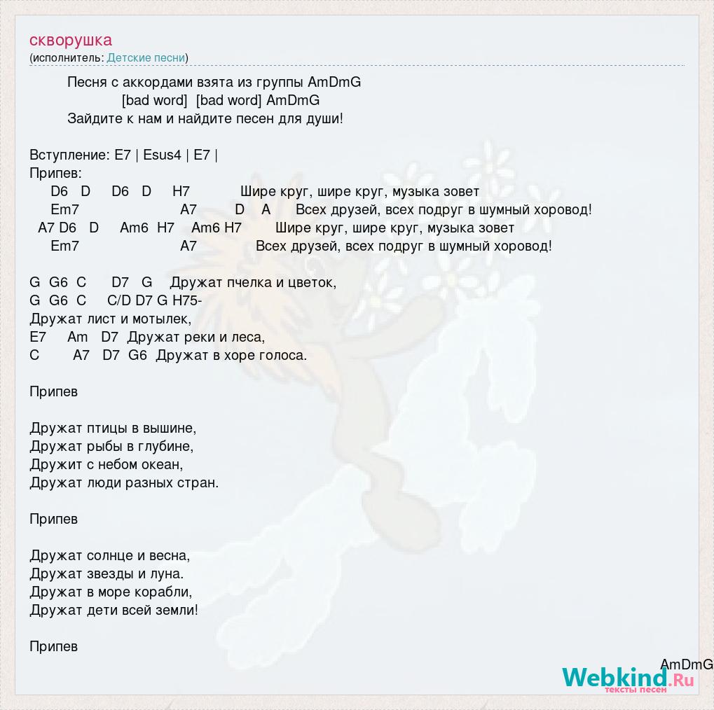 Песня с аккордами взята из группы AmDmG [bad word] [bad word] AmDmG Зайдите к нам и найдите песен для души! Вступление: E7 | Esus4 | E7 | Припев: D6 D D6 D H7 Шире круг, шире круг, музыка зовет Em7 A7 D A Всех друзей, всех подруг в шумный хоровод! A7 D6 D Am6 H7 Am6 H7 Шире круг, шире круг, музыка зовет Em7 A7 Всех друзей, всех подруг в шумный хоровод! G G6 C D7 G Дружат пчелка и цветок, G G6 C C/D D7 G H75- Дружат лист и мотылек, E7 Am D7 Дружат реки и леса, C A7 D7 G6 Дружат в хоре голоса. Припев Дружат птицы в вышине, Дружат рыбы в глубине, Дружит с небом океан, Дружат люди разных стран. Припев Дружат солнце и весна, Дружат звезды и луна. Дружат в море корабли, Дружат дети всей земли! Припев AmDmG