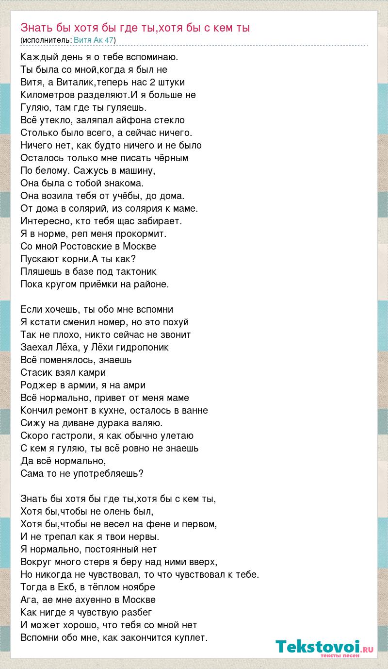 Каждый день я о тебе вспоминаю. Ты была со мной,когда я был не Витя, а Виталик,теперь нас 2 штуки Километров разделяют.И я больше не Гуляю, там где ты гуляешь. Всё утекло, заляпал айфона стекло Столько было всего, а сейчас ничего. Ничего нет, как будто ничего и не было Осталось только мне писать чёрным По белому. Сажусь в машину, Она была с тобой знакома. Она возила тебя от учёбы, до дома. От дома в солярий, из солярия к маме. Интересно, кто тебя щас забирает. Я в норме, реп меня прокормит. Со мной Ростовские в Москве Пускают корни.А ты как? Пляшешь в базе под тактоник Пока кругом приёмки на районе. Если хочешь, ты обо мне вспомни Я кстати сменил номер, но это похуй Так не плохо, никто сейчас не звонит Заехал Лёха, у Лёхи гидропоник Всё поменялось, знаешь Стасик взял камри Роджер в армии, я на амри Всё нормально, привет от меня маме Кончил ремонт в кухне, осталось в ванне Сижу на диване дурака валяю. Скоро гастроли, я как обычно улетаю С кем я гуляю, ты всё ровно не знаешь Да всё нормально, Сама то не употребляешь? Знать бы хотя бы где ты,хотя бы с кем ты, Хотя бы,чтобы не олень был, Хотя бы,чтобы не весел на фене и первом, И не трепал как я твои нервы. Я нормально, постоянный нет Вокруг много стерв я беру над ними вверх, Но никогда не чувствовал, то что чувствовал к тебе. Тогда в Екб, в тёплом ноябре Ага, ае мне ахуенно в Москве Как нигде я чувствую разбег И может хорошо, что тебя со мной нет Вспомни обо мне, как закончится куплет.