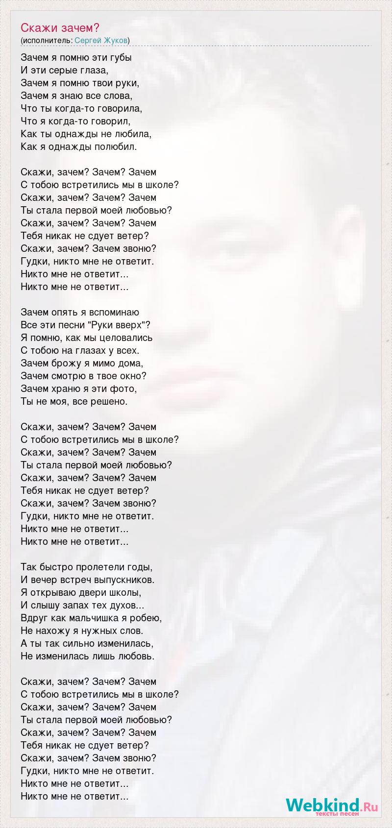 Зачем я помню эти губы И эти серые глаза, Зачем я помню твои руки, Зачем я знаю все слова, Что ты когда-то говорила, Что я когда-то говорил, Как ты однажды не любила, Как я однажды полюбил. Скажи, зачем? Зачем? Зачем С тобою встретились мы в школе? Скажи, зачем? Зачем? Зачем Ты стала первой моей любовью? Скажи, зачем? Зачем? Зачем Тебя никак не сдует ветер? Скажи, зачем? Зачем звоню? Гудки, никто мне не ответит. Никто мне не ответит... Никто мне не ответит... Зачем опять я вспоминаю Все эти песни "Руки вверх"? Я помню, как мы целовались С тобою на глазах у всех. Зачем брожу я мимо дома, Зачем смотрю в твое окно? Зачем храню я эти фото, Ты не моя, все решено. Скажи, зачем? Зачем? Зачем С тобою встретились мы в школе? Скажи, зачем? Зачем? Зачем Ты стала первой моей любовью? Скажи, зачем? Зачем? Зачем Тебя никак не сдует ветер? Скажи, зачем? Зачем звоню? Гудки, никто мне не ответит. Никто мне не ответит... Никто мне не ответит... Так быстро пролетели годы, И вечер встреч выпускников. Я открываю двери школы, И слышу запах тех духов... Вдруг как мальчишка я робею, Не нахожу я нужных слов. А ты так сильно изменилась, Не изменилась лишь любовь. Скажи, зачем? Зачем? Зачем С тобою встретились мы в школе? Скажи, зачем? Зачем? Зачем Ты стала первой моей любовью? Скажи, зачем? Зачем? Зачем Тебя никак не сдует ветер? Скажи, зачем? Зачем звоню? Гудки, никто мне не ответит. Никто мне не ответит... Никто мне не ответит...