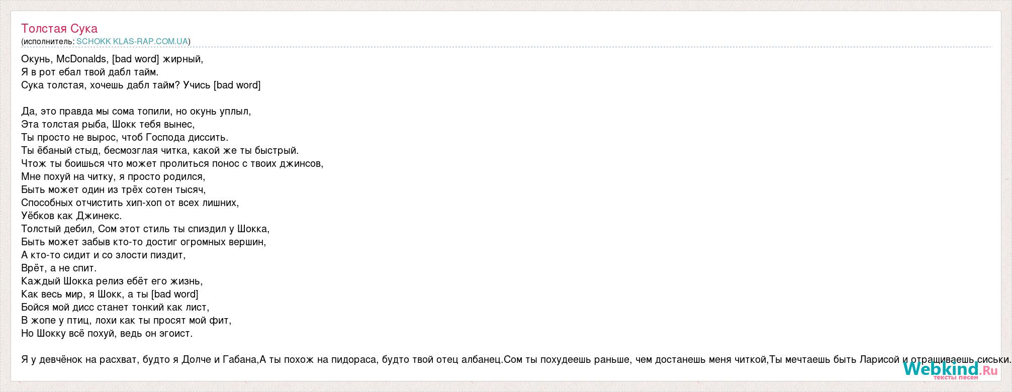 Окунь, McDonalds, [bad word] жирный, Я в рот ебал твой дабл тайм. Сука толстая, хочешь дабл тайм? Учись [bad word] Да, это правда мы сома топили, но окунь уплыл, Эта толстая рыба, Шокк тебя вынес, Ты просто не вырос, чтоб Господа диссить. Ты ёбаный стыд, бесмозглая читка, какой же ты быстрый. Чтож ты боишься что может пролиться понос с твоих джинсов, Мне похуй на читку, я просто родился, Быть может один из трёх сотен тысяч, Способных отчистить хип-хоп от всех лишних, Уёбков как Джинекс. Толстый дебил, Сом этот стиль ты спиздил у Шокка, Быть может забыв кто-то достиг огромных вершин, А кто-то сидит и со злости пиздит, Врёт, а не спит. Каждый Шокка релиз ебёт его жизнь, Как весь мир, я Шокк, а ты [bad word] Бойся мой дисс станет тонкий как лист, В жопе у птиц, лохи как ты просят мой фит, Но Шокку всё похуй, ведь он эгоист. Я у девчёнок на расхват, будто я Долче и Габана,А ты похож на пидораса, будто твой отец албанец.Сом ты похудеешь раньше, чем достанешь меня читкой,Ты мечтаешь быть Ларисой и отращиваешь сиськи.