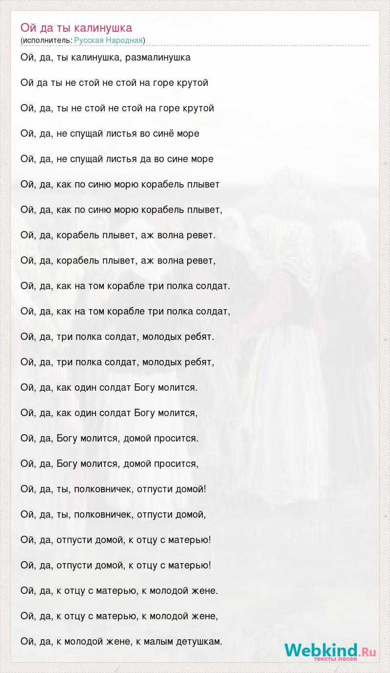 Ой, да, ты калинушка, размалинушка Ой да ты не стой не стой на горе крутой Ой, да, ты не стой не стой на горе крутой Ой, да, не спущай листья во синё море Ой, да, не спущай листья да во сине море Ой, да, как по синю морю корабель плывет Ой, да, как по синю морю корабель плывет, Ой, да, корабель плывет, аж волна ревет. Ой, да, корабель плывет, аж волна ревет, Ой, да, как на том корабле три полка солдат. Ой, да, как на том корабле три полка солдат, Ой, да, три полка солдат, молодых ребят. Ой, да, три полка солдат, молодых ребят, Ой, да, как один солдат Богу молится. Ой, да, как один солдат Богу молится, Ой, да, Богу молится, домой просится. Ой, да, Богу молится, домой просится, Ой, да, ты, полковничек, отпусти домой! Ой, да, ты, полковничек, отпусти домой, Ой, да, отпусти домой, к отцу с матерью! Ой, да, отпусти домой, к отцу с матерью! Ой, да, к отцу с матерью, к молодой жене. Ой, да, к отцу с матерью, к молодой жене, Ой, да, к молодой жене, к малым детушкам.
