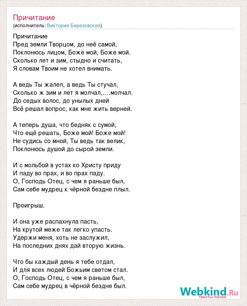 Причитание Пред земли Творцом, до неё самой, Поклонюсь лицом, Боже мой, Боже мой. Сколько лет и зим, стыдно и считать, Я словам Твоим не хотел внимать. А ведь Ты жалел, а ведь Ты стучал, Сколько ж зим и лет я молчал,….молчал. До седых волос, до унылых дней Всё решал вопрос, как мне жить верней. А теперь душа, что бедняк с сумой, Что ещё решать, Боже мой! Боже мой! Не судись со мной, Ты ведь так велик, Поклонюсь душой до сырой земли. И с мольбой в устах ко Христу приду И паду во прах, и во прах паду. О, Господь Отец, с чем я раньше был, Сам себе мудрец к чёрной бездне плыл. Проигрыш. И она уже распахнула пасть, На крутой меже так легко упасть. Удержи меня, хоть не заслужил, На последних днях дай вторую жизнь. Что бы каждый день я тебе отдал, И для всех людей Божьим светом стал. О, Господь Отец, с чем я раньше был, Сам себе мудрец в чёрной бездне был.