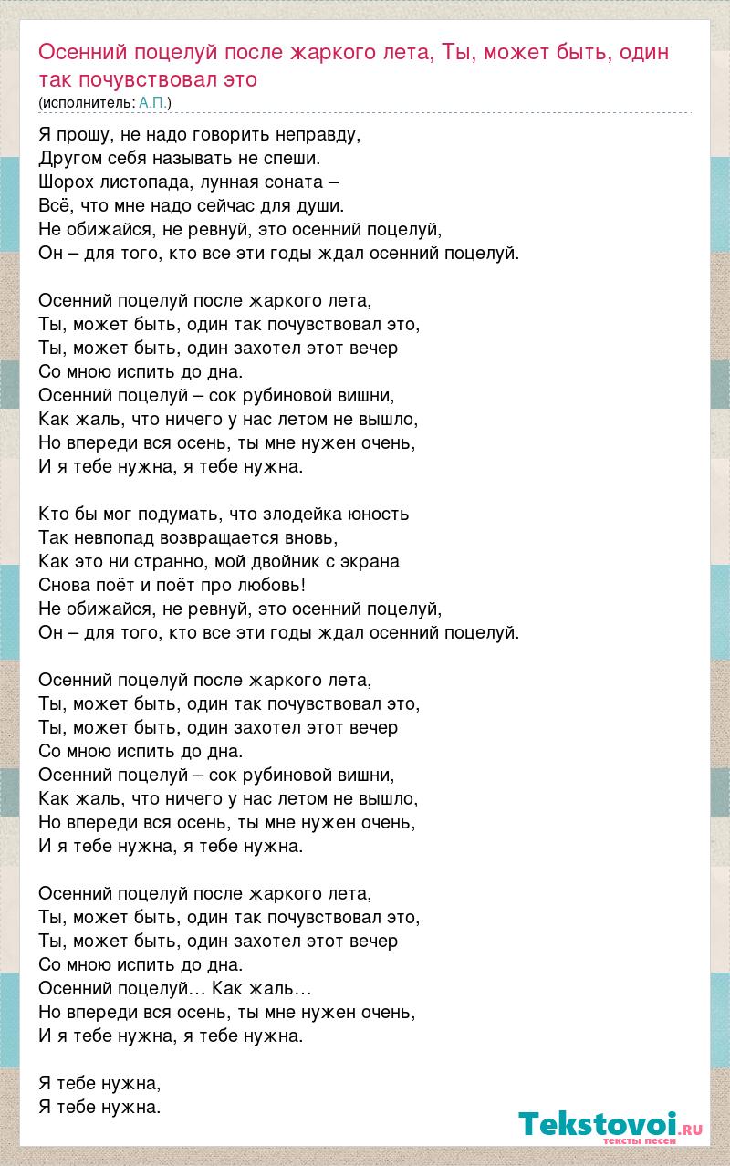 Я прошу, не надо говорить неправду, Другом себя называть не спеши. Шорох листопада, лунная соната – Всё, что мне надо сейчас для души. Не обижайся, не ревнуй, это осенний поцелуй, Он – для того, кто все эти годы ждал осенний поцелуй. Осенний поцелуй после жаркого лета, Ты, может быть, один так почувствовал это, Ты, может быть, один захотел этот вечер Со мною испить до дна. Осенний поцелуй – сок рубиновой вишни, Как жаль, что ничего у нас летом не вышло, Но впереди вся осень, ты мне нужен очень, И я тебе нужна, я тебе нужна. Кто бы мог подумать, что злодейка юность Так невпопад возвращается вновь, Как это ни странно, мой двойник с экрана Снова поёт и поёт про любовь! Не обижайся, не ревнуй, это осенний поцелуй, Он – для того, кто все эти годы ждал осенний поцелуй. Осенний поцелуй после жаркого лета, Ты, может быть, один так почувствовал это, Ты, может быть, один захотел этот вечер Со мною испить до дна. Осенний поцелуй – сок рубиновой вишни, Как жаль, что ничего у нас летом не вышло, Но впереди вся осень, ты мне нужен очень, И я тебе нужна, я тебе нужна. Осенний поцелуй после жаркого лета, Ты, может быть, один так почувствовал это, Ты, может быть, один захотел этот вечер Со мною испить до дна. Осенний поцелуй… Как жаль… Но впереди вся осень, ты мне нужен очень, И я тебе нужна, я тебе нужна. Я тебе нужна, Я тебе нужна.