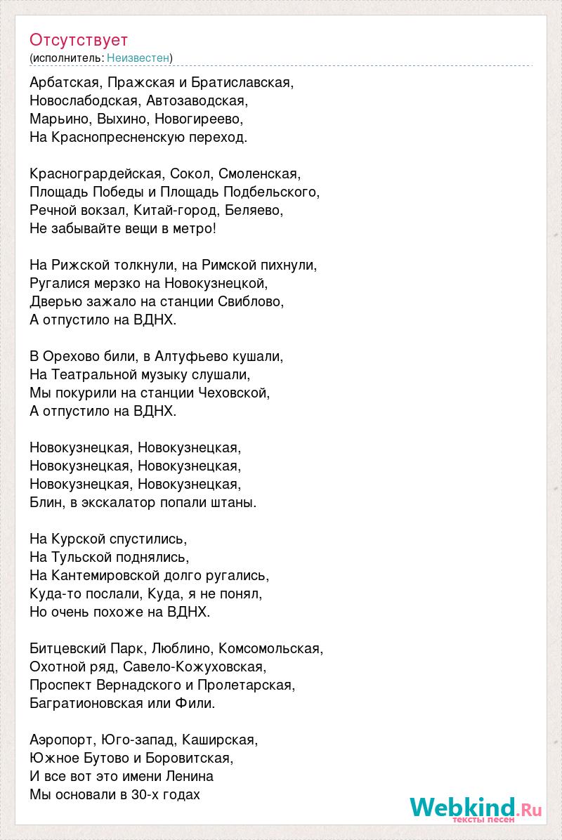 Арбатская, Пражская и Братиславская, Новослабодская, Автозаводская, Марьино, Выхино, Новогиреево, На Краснопресненскую переход. Красногрардейская, Сокол, Смоленская, Площадь Победы и Площадь Подбельского, Речной вокзал, Китай-город, Беляево, Не забывайте вещи в метро! На Рижской толкнули, на Римской пихнули, Ругалися мерзко на Новокузнецкой, Дверью зажало на станции Свиблово, А отпустило на ВДНХ. В Орехово били, в Алтуфьево кушали, На Театральной музыку слушали, Мы покурили на станции Чеховской, А отпустило на ВДНХ. Новокузнецкая, Новокузнецкая, Новокузнецкая, Новокузнецкая, Новокузнецкая, Новокузнецкая, Блин, в экскалатор попали штаны. На Курской спустились, На Тульской поднялись, На Кантемировской долго ругались, Куда-то послали, Куда, я не понял, Но очень похоже на ВДНХ. Битцевский Парк, Люблино, Комсомольская, Охотной ряд, Савело-Кожуховская, Проспект Вернадского и Пролетарская, Багратионовская или Фили. Аэропорт, Юго-запад, Каширская, Южное Бутово и Боровитская, И все вот это имени Ленина Мы основали в 30-х годах
