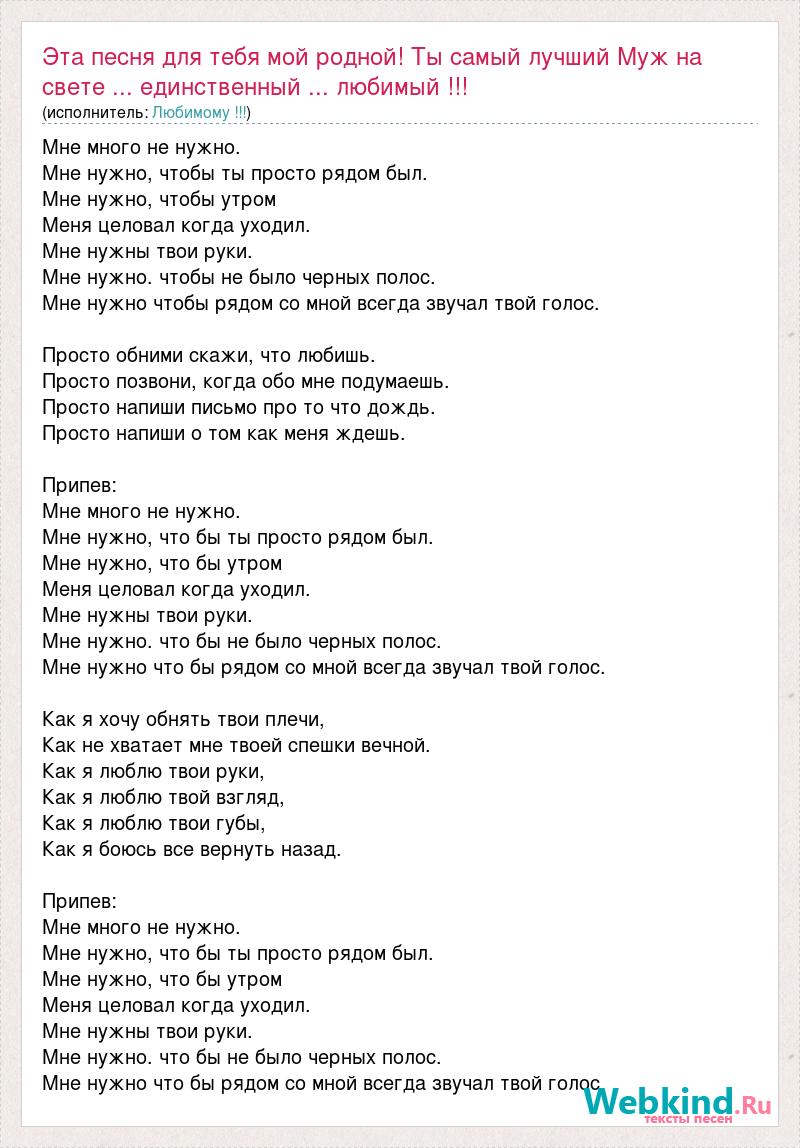 Мне много не нужно. Мне нужно, чтобы ты просто рядом был. Мне нужно, чтобы утром Меня целовал когда уходил. Мне нужны твои руки. Мне нужно. чтобы не было черных полос. Мне нужно чтобы рядом со мной всегда звучал твой голос. Просто обними скажи, что любишь. Просто позвони, когда обо мне подумаешь. Просто напиши письмо про то что дождь. Просто напиши о том как меня ждешь. Припев: Мне много не нужно. Мне нужно, что бы ты просто рядом был. Мне нужно, что бы утром Меня целовал когда уходил. Мне нужны твои руки. Мне нужно. что бы не было черных полос. Мне нужно что бы рядом со мной всегда звучал твой голос. Как я хочу обнять твои плечи, Как не хватает мне твоей спешки вечной. Как я люблю твои руки, Как я люблю твой взгляд, Как я люблю твои губы, Как я боюсь все вернуть назад. Припев: Мне много не нужно. Мне нужно, что бы ты просто рядом был. Мне нужно, что бы утром Меня целовал когда уходил. Мне нужны твои руки. Мне нужно. что бы не было черных полос. Мне нужно что бы рядом со мной всегда звучал твой голос