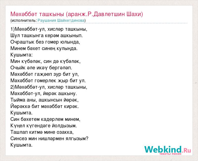 1)Мәхәббәт-ул, хисләр ташкыны, Шул ташкынга керәм ашкынып. Очраштык без гомер юлында, Минем бәхет синең кулыңда. Кушымта: Мин күбәләк, син дә күбәләк, Очыйк әле икәү бергәләп. Мәхәббәт гаҗәеп зур бит ул, Мәхәббәт гомерлек җыр бит ул. 2)Мәхәббәт-ул, хисләр ташкыны, Мәхәббәт-ул, йөрәк ашкыну. Тыйма аны, ашкынсын йөрәк, Йөрәккә бит мәхәббәт кирәк. Кушымта. Син бәхетем кадерлем минем, Күңел күгендәге йолдызым. Ташлап китмә мине озакка, Синсез мин нишләрмен ялгызым? Кушымта.