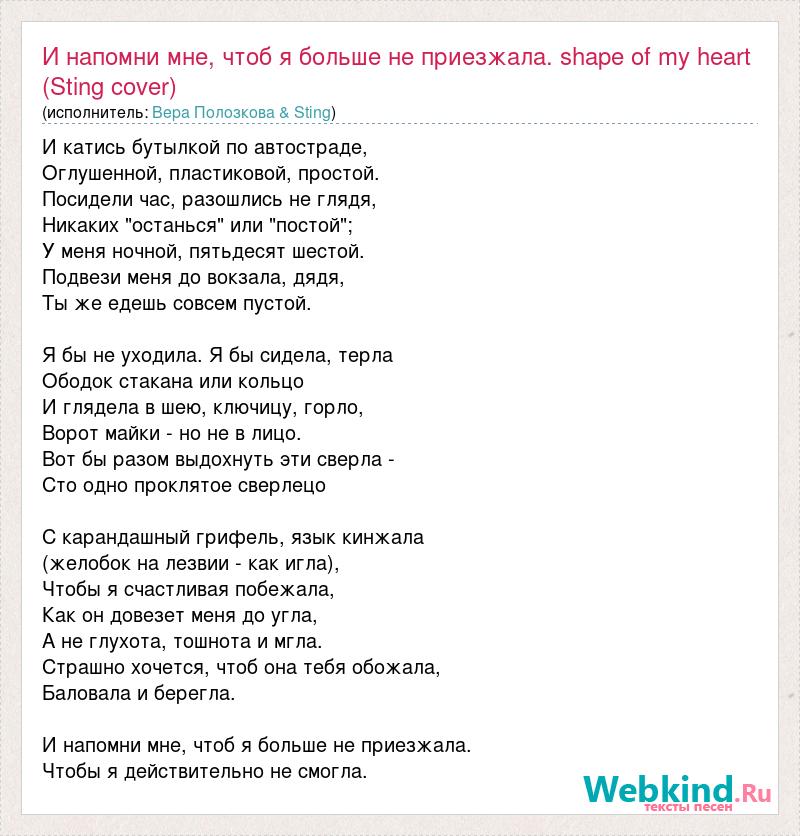 Главная→Исполнители→Вера Полозкова & Sting→И напомни мне, чтоб я больше не приезжала. shape of my heart (Sting cover)